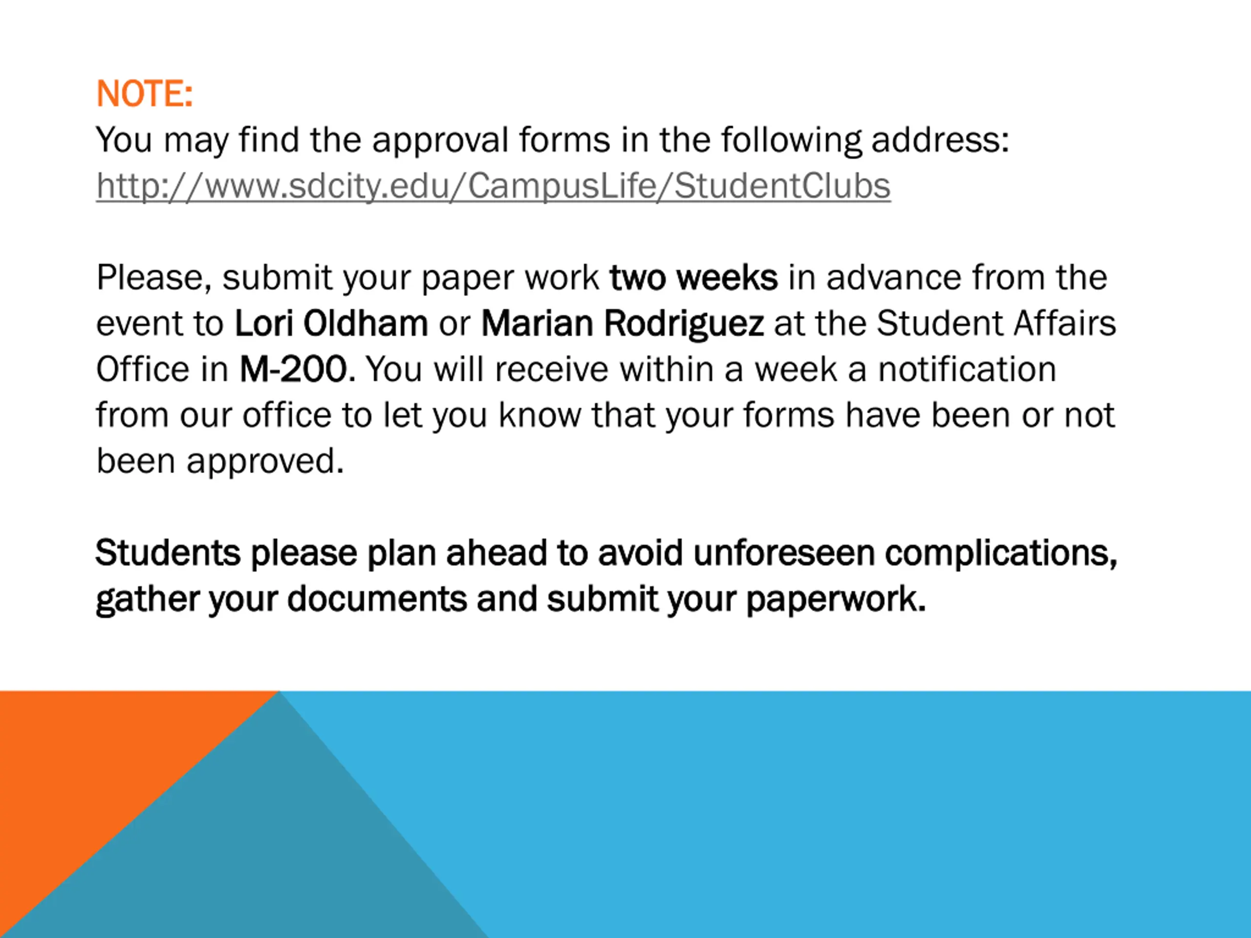 NOTE: NOTE: You may find the approval forms in the following address: http://www.sdcity.edu/CampusLife/StudentClubs Please, submit your paper work two weeks event to Lori Oldham Lori Oldham or Marian Rodriguez Office in M M- -200 200. You will receive within a week a notification from our office to let you know that your forms have been or not been approved. two weeks in advance from the Marian Rodriguez at the Student Affairs Students Students please plan ahead to avoid unforeseen complications, please plan ahead to avoid unforeseen complications, gather your documents and submit your paperwork. gather your documents and submit your paperwork.