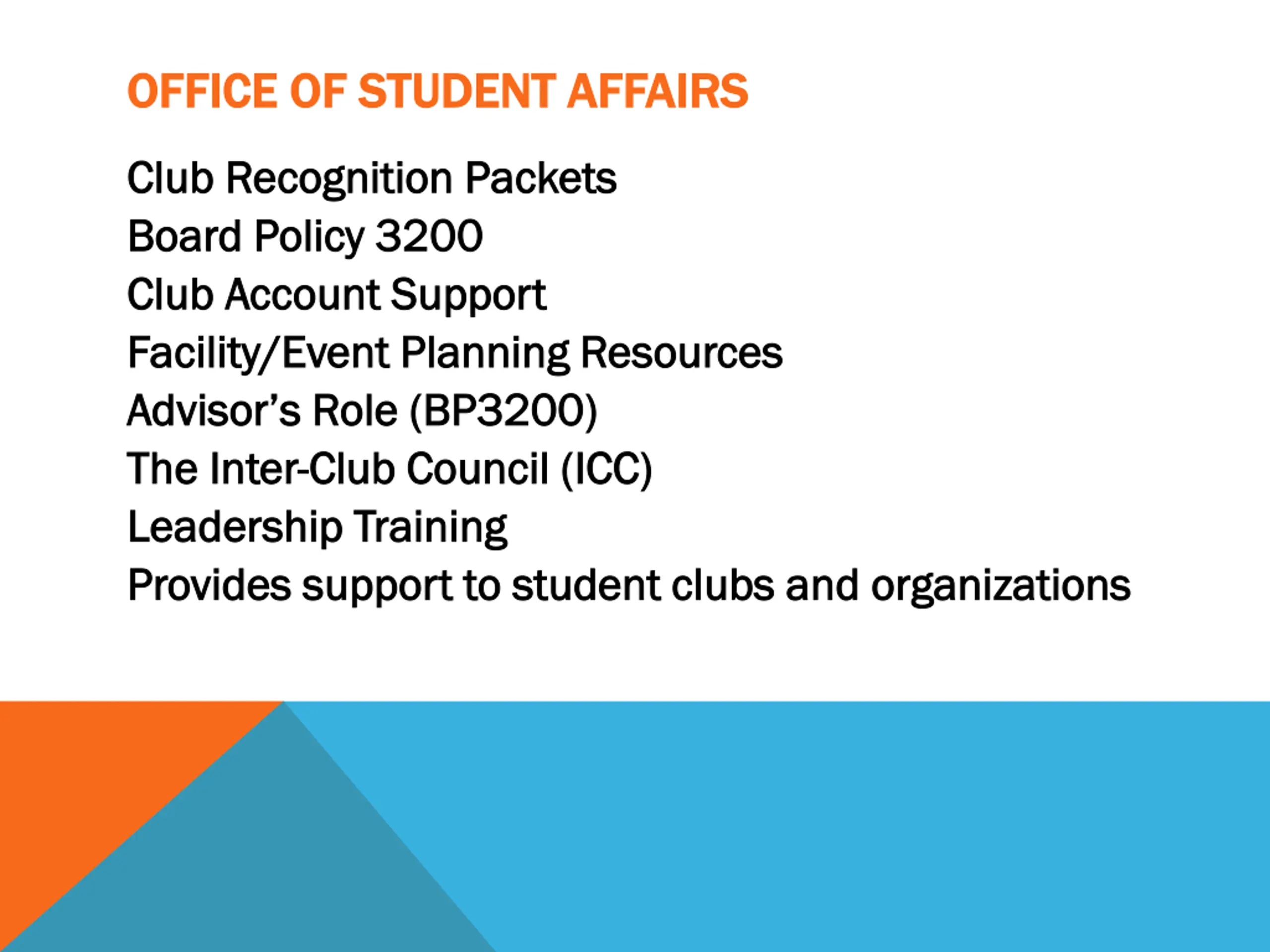 OFFICE OF STUDENT AFFAIRS OFFICE OF STUDENT AFFAIRS Club Recognition Packets Club Recognition Packets Board Policy 3200 Board Policy 3200 Club Club Account Support Account Support Facility/Event Planning Resources Facility/Event Planning Resources Advisor s Role (BP3200) Advisor s Role (BP3200) The Inter The Inter- -Club Council (ICC) Club Council (ICC) Leadership Leadership Training Training Provides Provides support to student clubs and organizations support to student clubs and organizations
