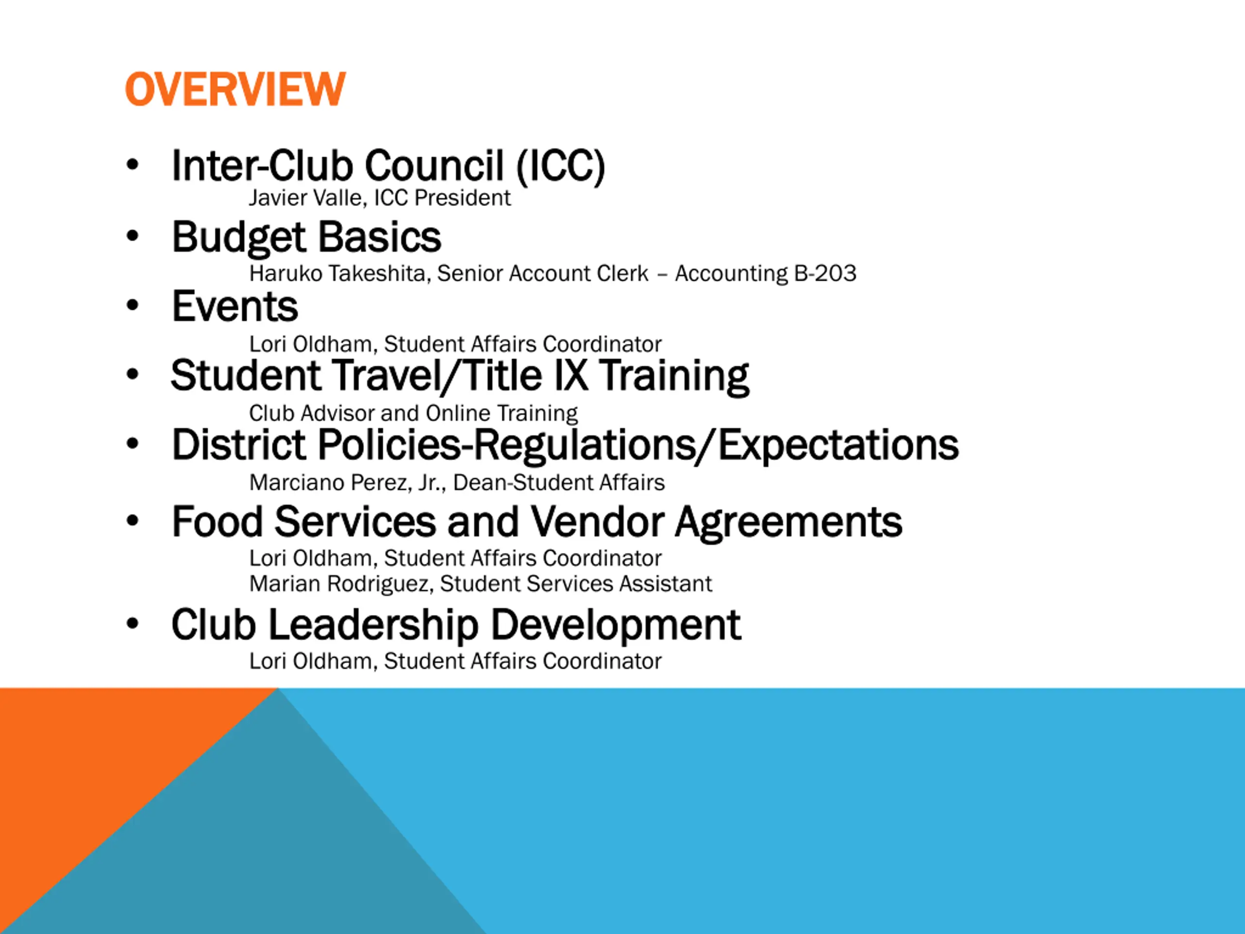 OVERVIEW OVERVIEW Inter Inter- -Club Council (ICC) Club Council (ICC) Javier Valle, ICC President Budget Basics Budget Basics Haruko Takeshita, Senior Account Clerk Accounting B-203 Events Events Lori Oldham, Student Affairs Coordinator Student Travel/Title IX Training Student Travel/Title IX Training Club Advisor and Online Training District District Policies Policies- -Regulations/Expectations Regulations/Expectations Marciano Perez, Jr., Dean-Student Affairs Food Services and Food Services and Vendor Agreements Vendor Agreements Lori Oldham, Student Affairs Coordinator Marian Rodriguez, Student Services Assistant Club Leadership Development Club Leadership Development Lori Oldham, Student Affairs Coordinator