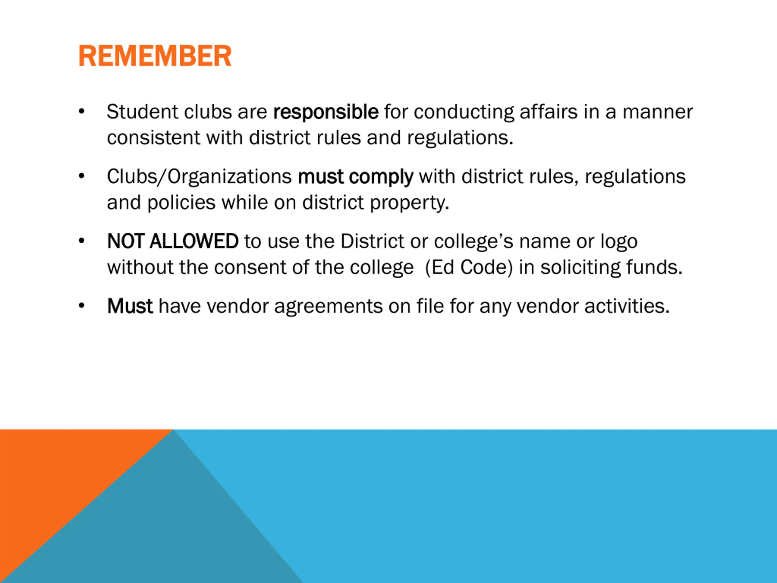 REMEMBER REMEMBER Student clubs are responsible consistent with district rules and regulations. responsible for conducting affairs in a manner Clubs/Organizations must comply and policies while on district property. must comply with district rules, regulations NOT ALLOWED NOT ALLOWED to use the District or college s name or logo without the consent of the college (Ed Code) in soliciting funds. Must Must have vendor agreements on file for any vendor activities.