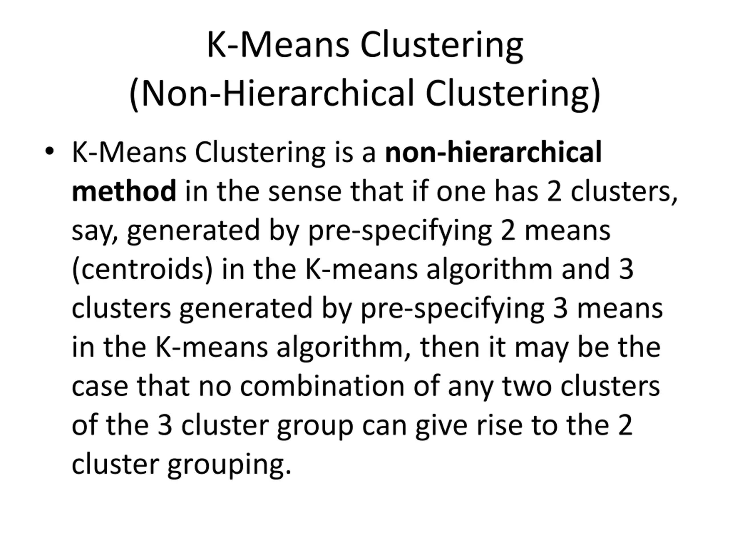 K-Means Clustering (Non-Hierarchical Clustering) K-Means Clustering is a non-hierarchical method in the sense that if one has 2 clusters, say, generated by pre-specifying 2 means (centroids) in the K-means algorithm and 3 clusters generated by pre-specifying 3 means in the K-means algorithm, then it may be the case that no combination of any two clusters of the 3 cluster group can give rise to the 2 cluster grouping.