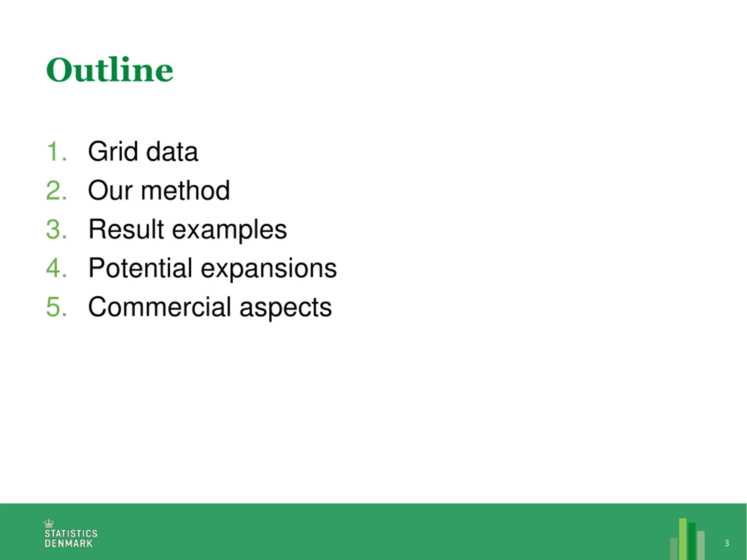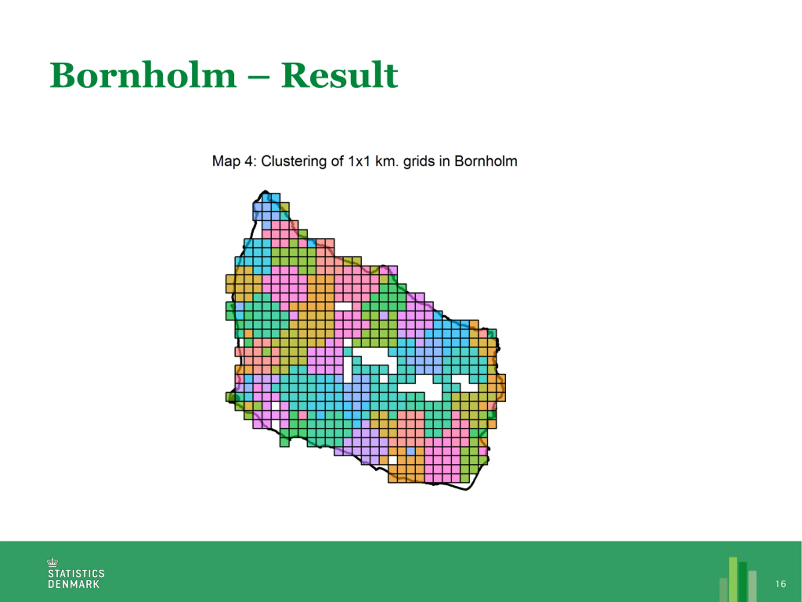 Commercial aspects (2 of 4) role Statistics Denmark. The primary role for Statistics Denmark in regards to clustering of grids is to be an alternative supplier. The primary demand for our clustering has been for us to be a supplier of simple clusters that are easy to understand and easy to use keeping it simple . Very often it seems like that the creator of the clusters tend to forget the important task of explaining and illustrating the methods used so this is an important factor for as a supplier. 20