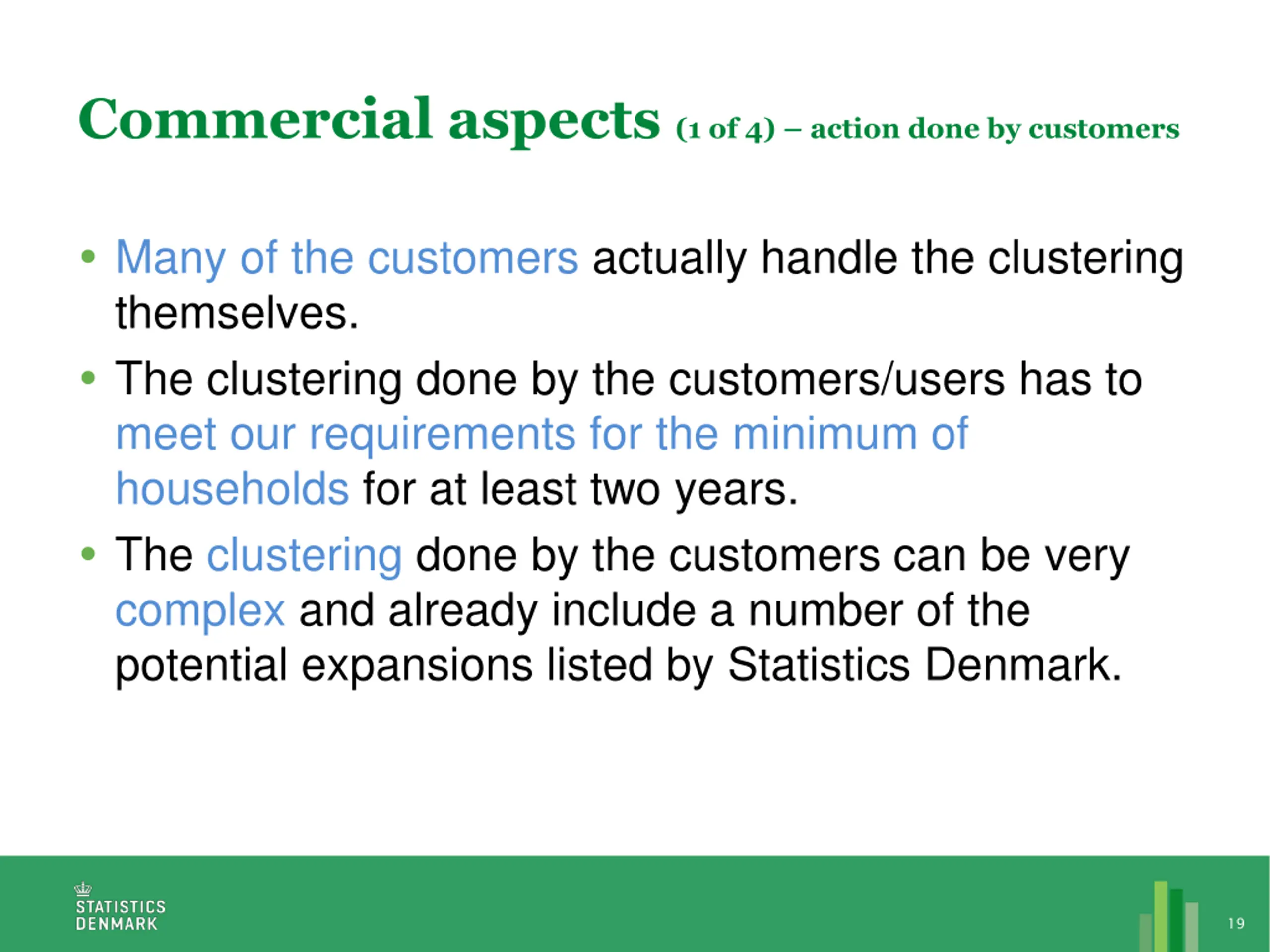 Commercial aspects (1 of 4) action done by customers Many of the customers actually handle the clustering themselves. The clustering done by the customers/users has to meet our requirements for the minimum of households for at least two years. The clustering done by the customers can be very complex and already include a number of the potential expansions listed by Statistics Denmark. 19