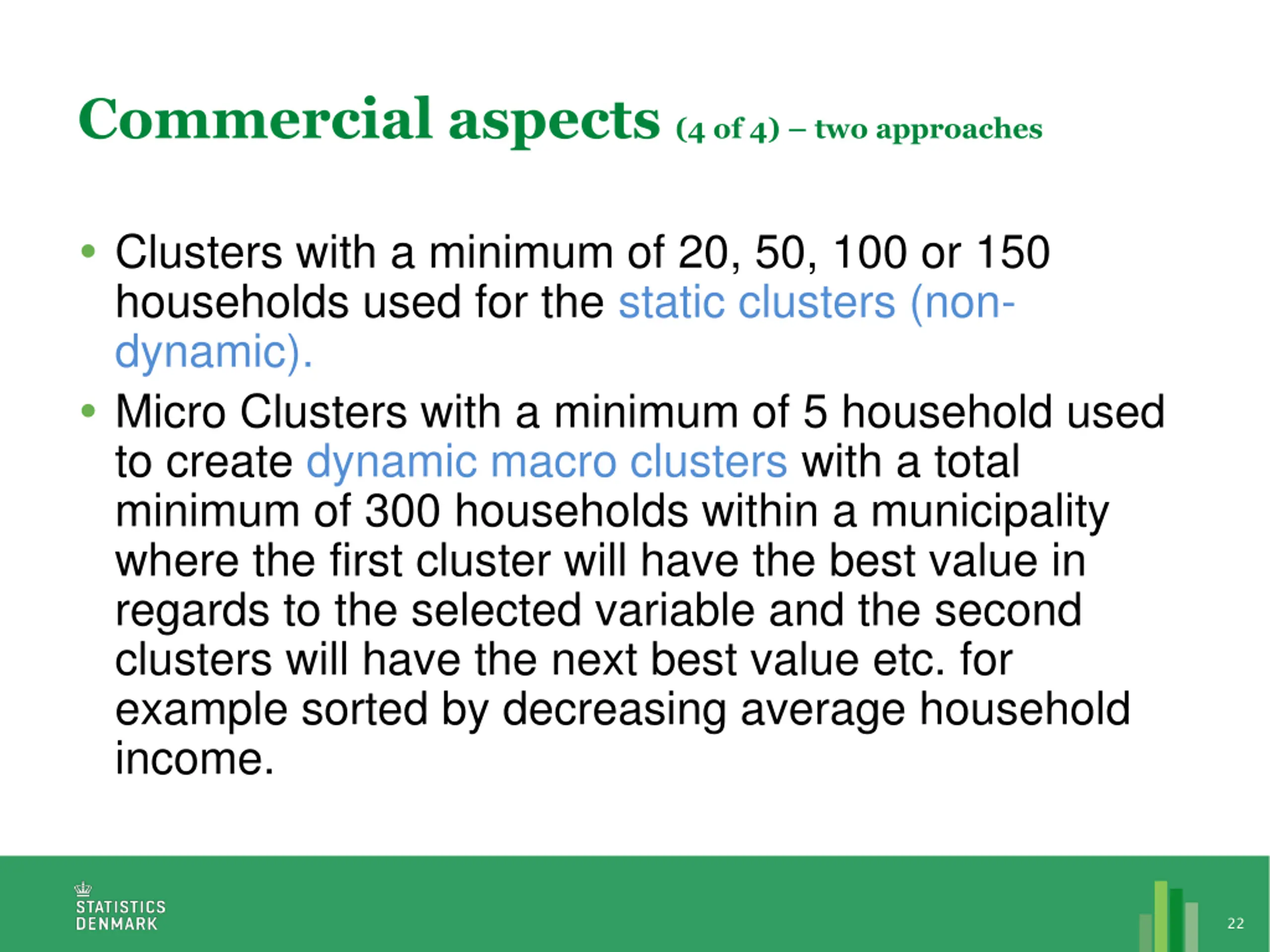 Commercial aspects (3 of 4) two approaches Clusters can be done either simple using nearest cell approach (as shown by Aksel ) or more complex including various factors in the algorithm creating more optimized clusters (as listed as potential expansions for Statistics Denmark and already used by existing customers). Clusters can then either be created first and then be fixed as static clusters (non-dynamic) and then variables can be added or the clusters can be created by using/sorting the selected variable making dynamic clusters (changed by each variable used). 21