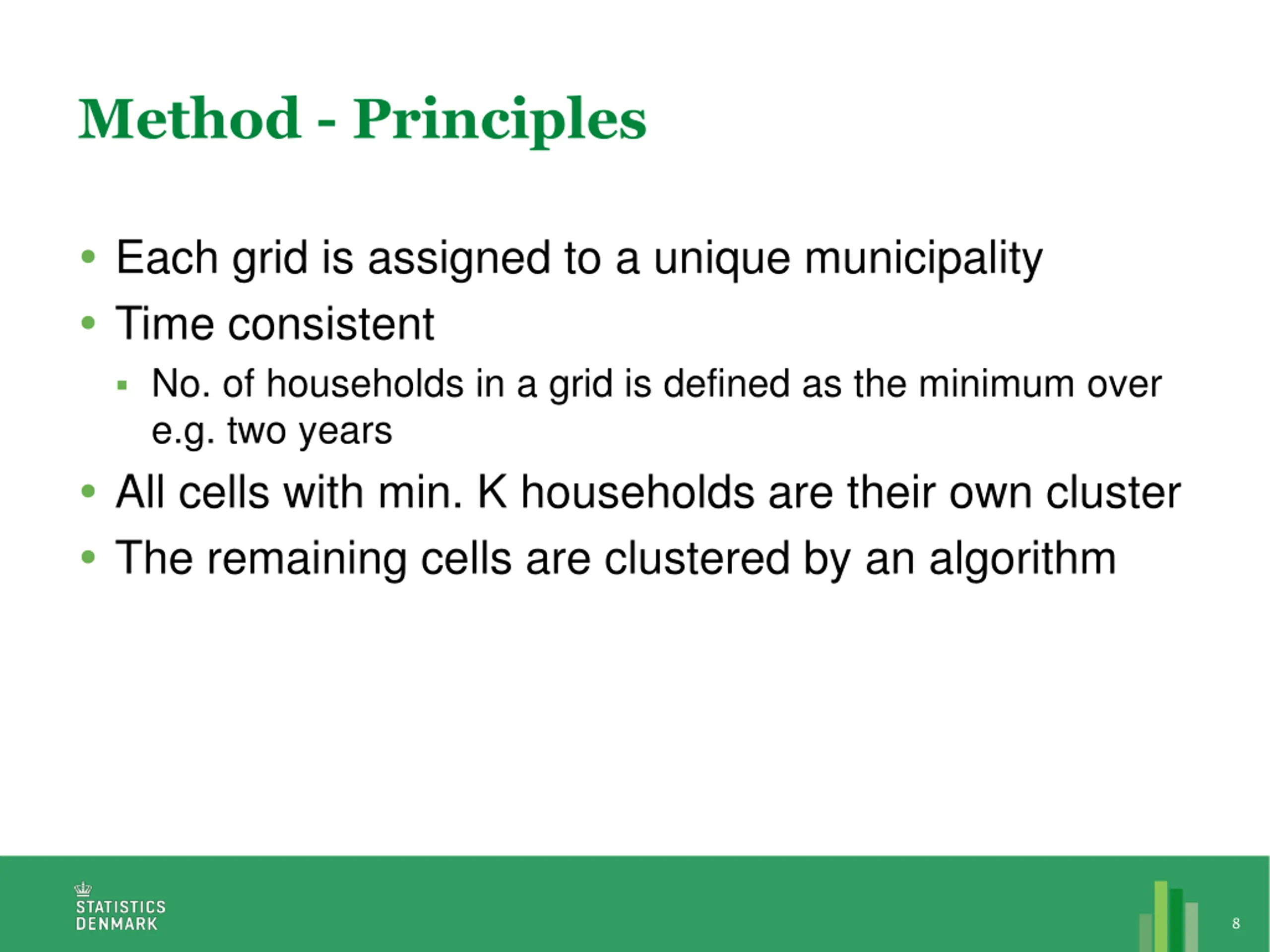 Method - Principles Each grid is assigned to a unique municipality Time consistent No. of households in a grid is defined as the minimum over e.g. two years All cells with min. K households are their own cluster The remaining cells are clustered by an algorithm 8
