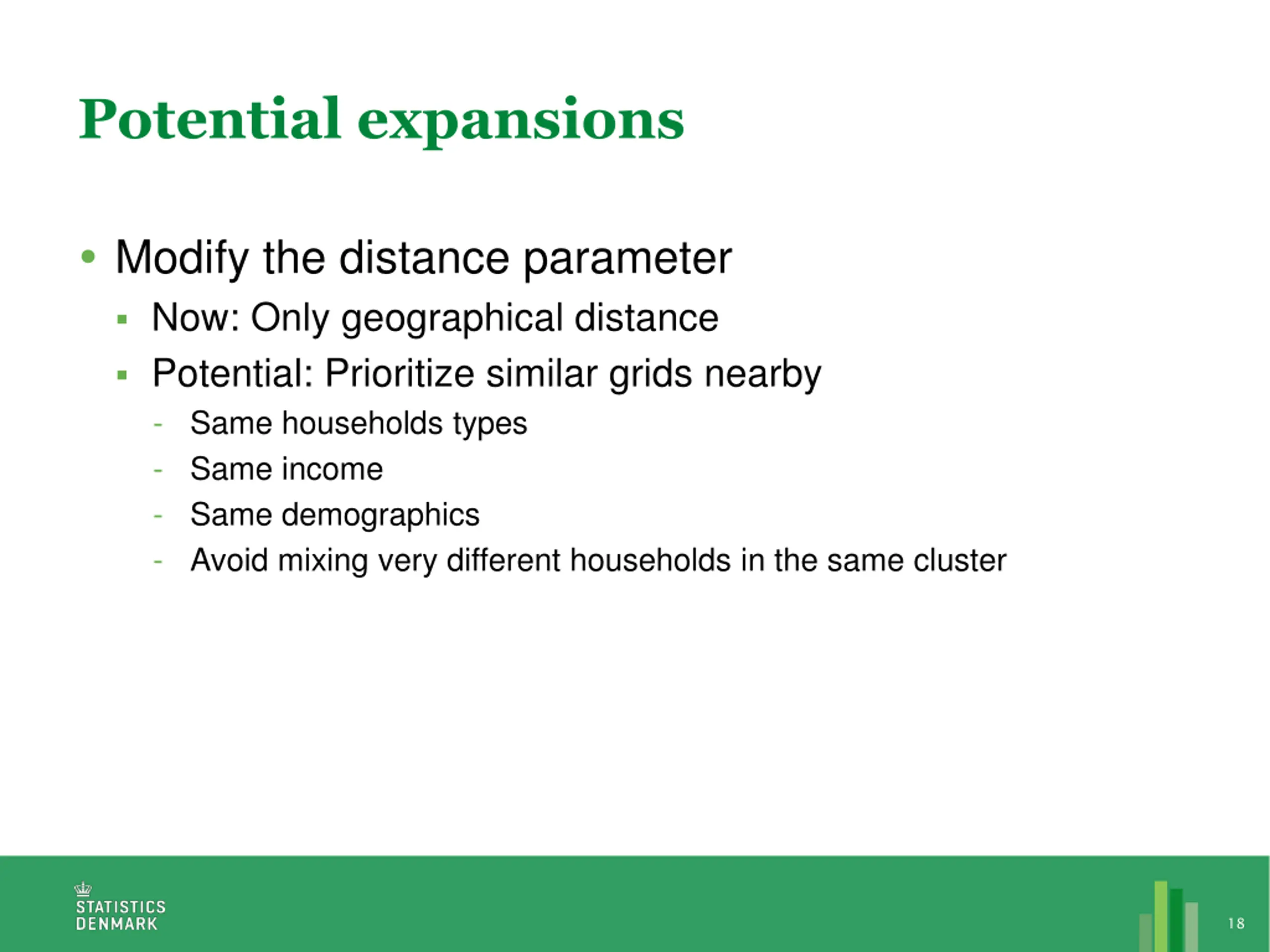 Potential expansions Modify the distance parameter Now: Only geographical distance Potential: Prioritize similar grids nearby - Same households types - Same income - Same demographics - Avoid mixing very different households in the same cluster 18