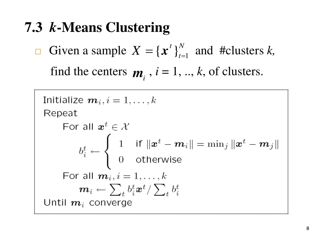 7.3 k-Means Clustering Given a sample and #clusters k, { } X = m t N t x = 1 find the centers , i = 1, .., k, of clusters. i 8