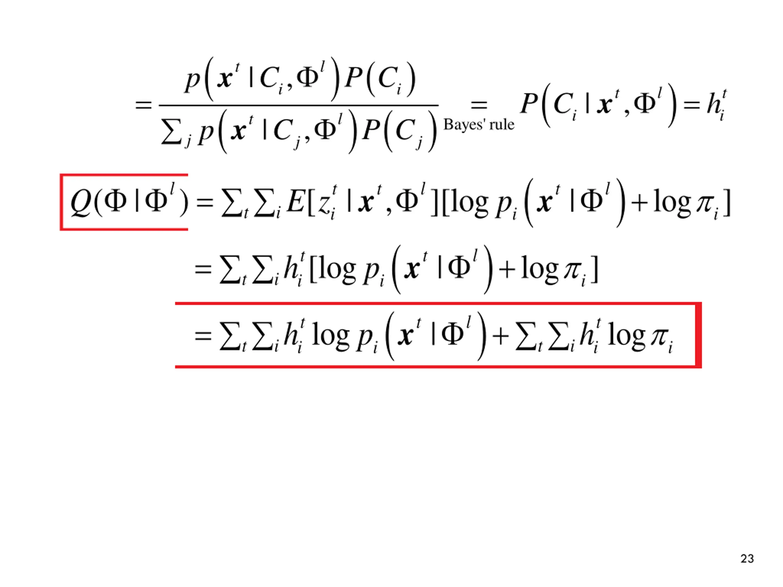 ( ) | , cL X Z The expectation of over Z : ( ) = l l ( | ) [ | , | , ] Q E L X Z X c ( ) N K = + t i t x [log | log ] E z p i i = = 1 1 t i ( ) N K = + t i t l t l x x [ | , ][log | log ] E z p i i = = 1 1 t i = E z = + = t i t l t i t l t i t l x x x , 0 ( 0 , ) 1 ( 1 , ) P z P z t i : 0/1 z ( ) ( | ) = = t t i l t i l x | 1, 1| p z P z = = = t i t l x ( 1 , ) P z ( ) t l x p Bayes' rule 22