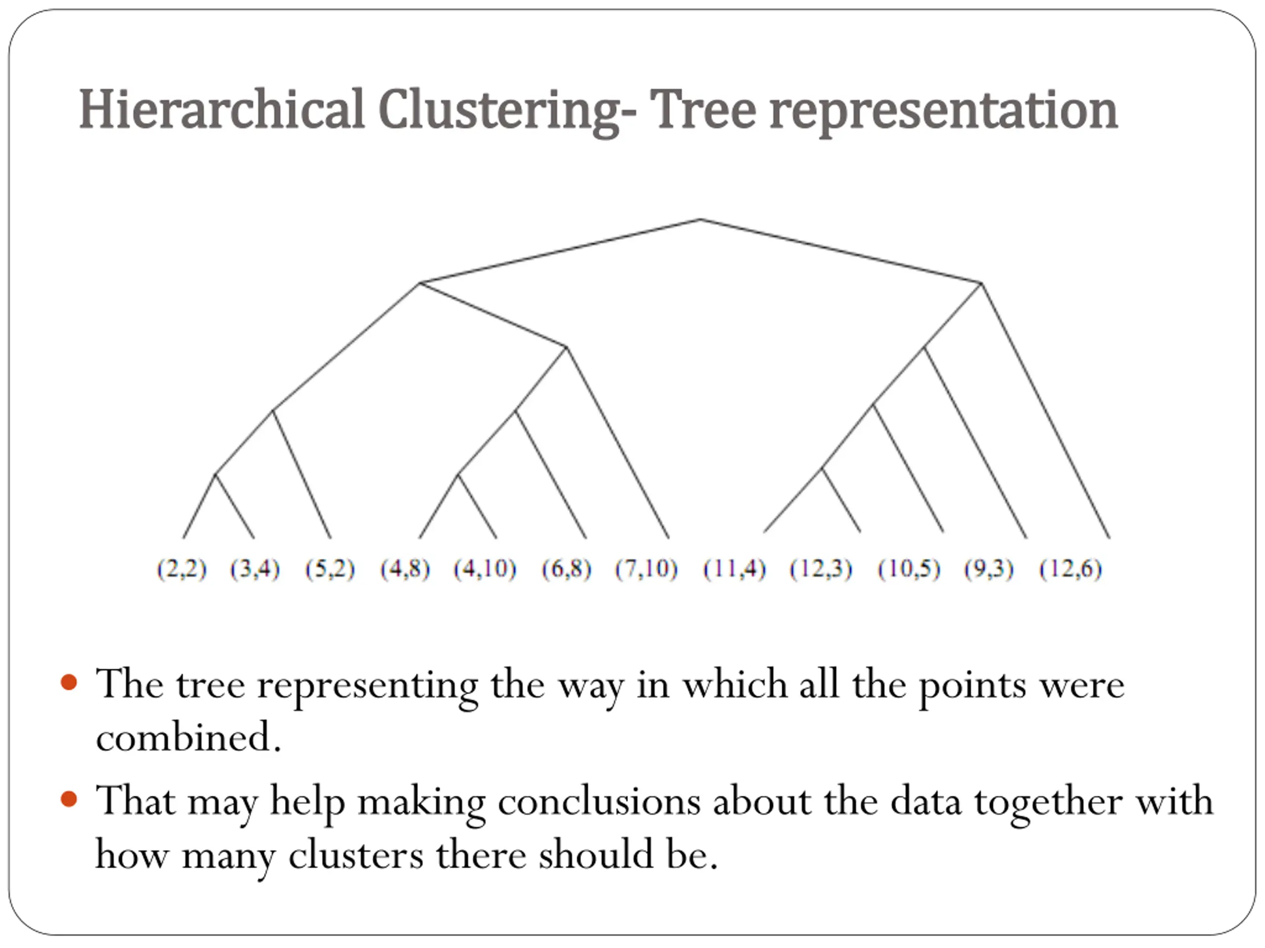Hierarchical Clustering Hierarchical Clustering- -Tree representation Tree representation The tree representing the way in which all the points were combined. That may help making conclusions about the data together with how many clusters there should be.