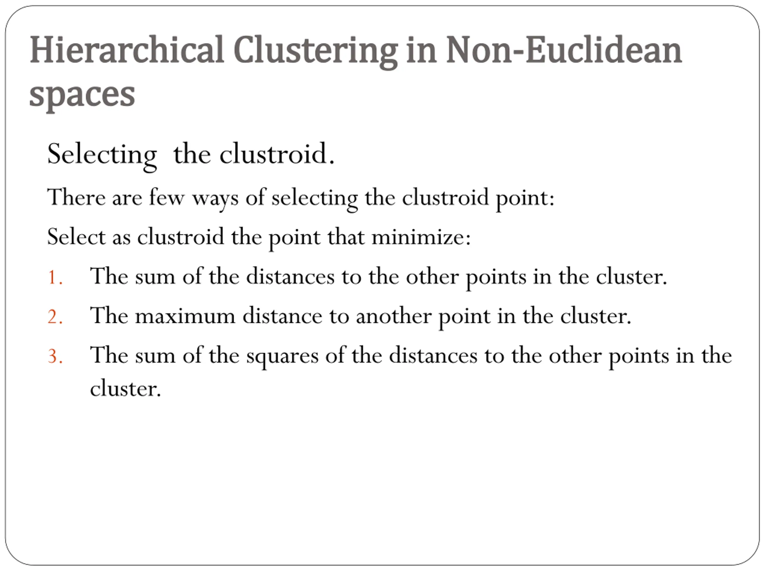 Hierarchical Clustering in Non Hierarchical Clustering in Non- -Euclidean spaces spaces Example: Euclidean Using edit distance. Cluster points: abcd, aecdb, abecb, ecdab. Their distances: Applying the three clustroid criteria to each of the four points: