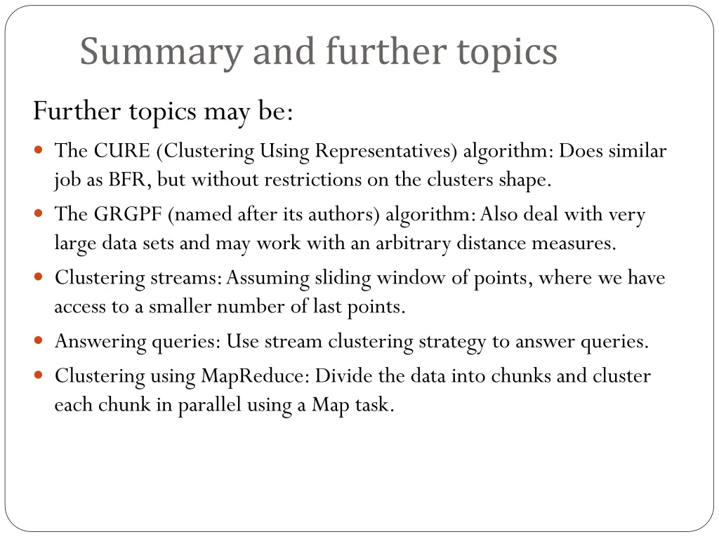 Summary and further topics Further topics may be: The CURE (Clustering Using Representatives) algorithm: Does similar job as BFR, but without restrictions on the clusters shape. The GRGPF (named after its authors) algorithm: Also deal with very large data sets and may work with an arbitrary distance measures. Clustering streams: Assuming sliding window of points, where we have access to a smaller number of last points. Answering queries: Use stream clustering strategy to answer queries. Clustering using MapReduce: Divide the data into chunks and cluster each chunk in parallel using a Map task.