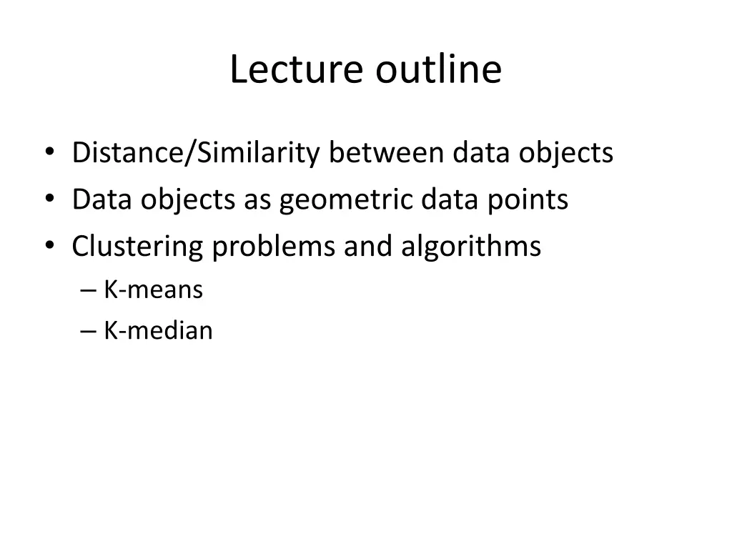 Lecture outline Distance/Similarity between data objects Data objects as geometric data points Clustering problems and algorithms K-means K-median