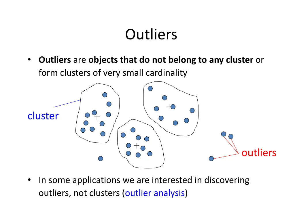 Outliers Outliers are objects that do not belong to any cluster or form clusters of very small cardinality cluster outliers In some applications we are interested in discovering outliers, not clusters (outlier analysis)