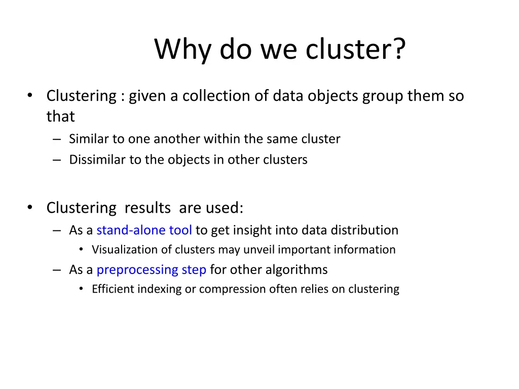 Why do we cluster? Clustering : given a collection of data objects group them so that Similar to one another within the same cluster Dissimilar to the objects in other clusters Clustering results are used: As a stand-alone tool to get insight into data distribution Visualization of clusters may unveil important information As a preprocessing step for other algorithms Efficient indexing or compression often relies on clustering
