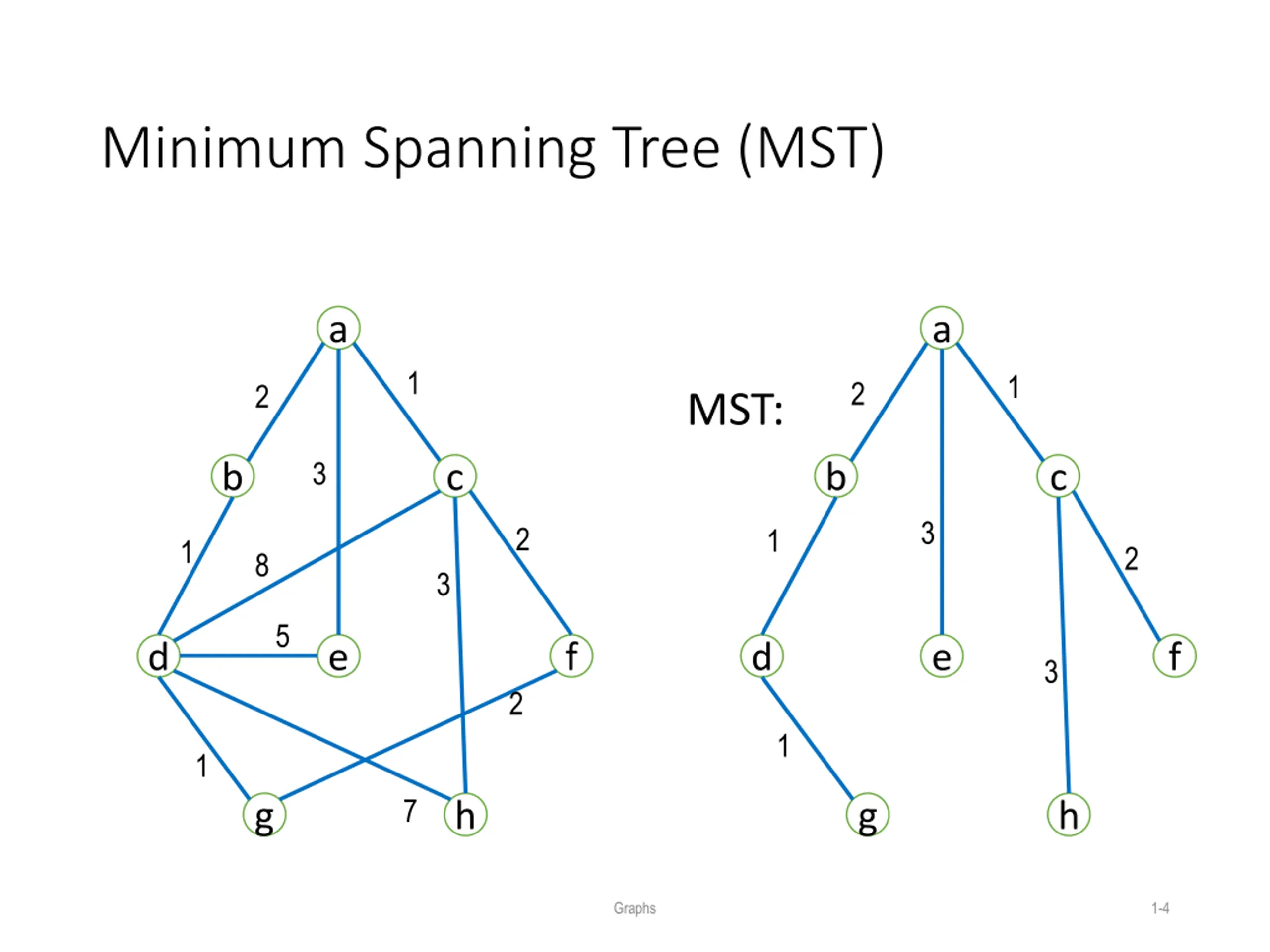 Minimum Spanning Tree (MST) a a 1 1 2 2 MST: 3 b c b c 3 2 1 1 2 8 3 5 d e f d e f 3 2 1 1 7 g h g h Graphs 1-4