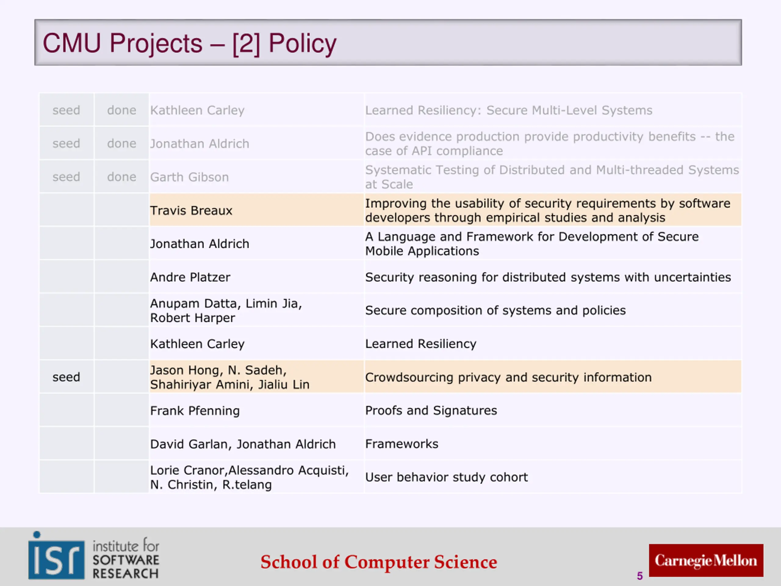 CMU Projects [2] Policy seed done Kathleen Carley Learned Resiliency: Secure Multi-Level Systems Does evidence production provide productivity benefits -- the case of API compliance Systematic Testing of Distributed and Multi-threaded Systems at Scale Improving the usability of security requirements by software developers through empirical studies and analysis A Language and Framework for Development of Secure Mobile Applications seed done Jonathan Aldrich seed done Garth Gibson Travis Breaux Jonathan Aldrich Andre Platzer Security reasoning for distributed systems with uncertainties Anupam Datta, Limin Jia, Robert Harper Secure composition of systems and policies Learned Resiliency Kathleen Carley Jason Hong, N. Sadeh, Shahiriyar Amini, Jialiu Lin seed Crowdsourcing privacy and security information Proofs and Signatures Frank Pfenning Frameworks David Garlan, Jonathan Aldrich Lorie Cranor,Alessandro Acquisti, N. Christin, R.telang User behavior study cohort School of Computer Science 5