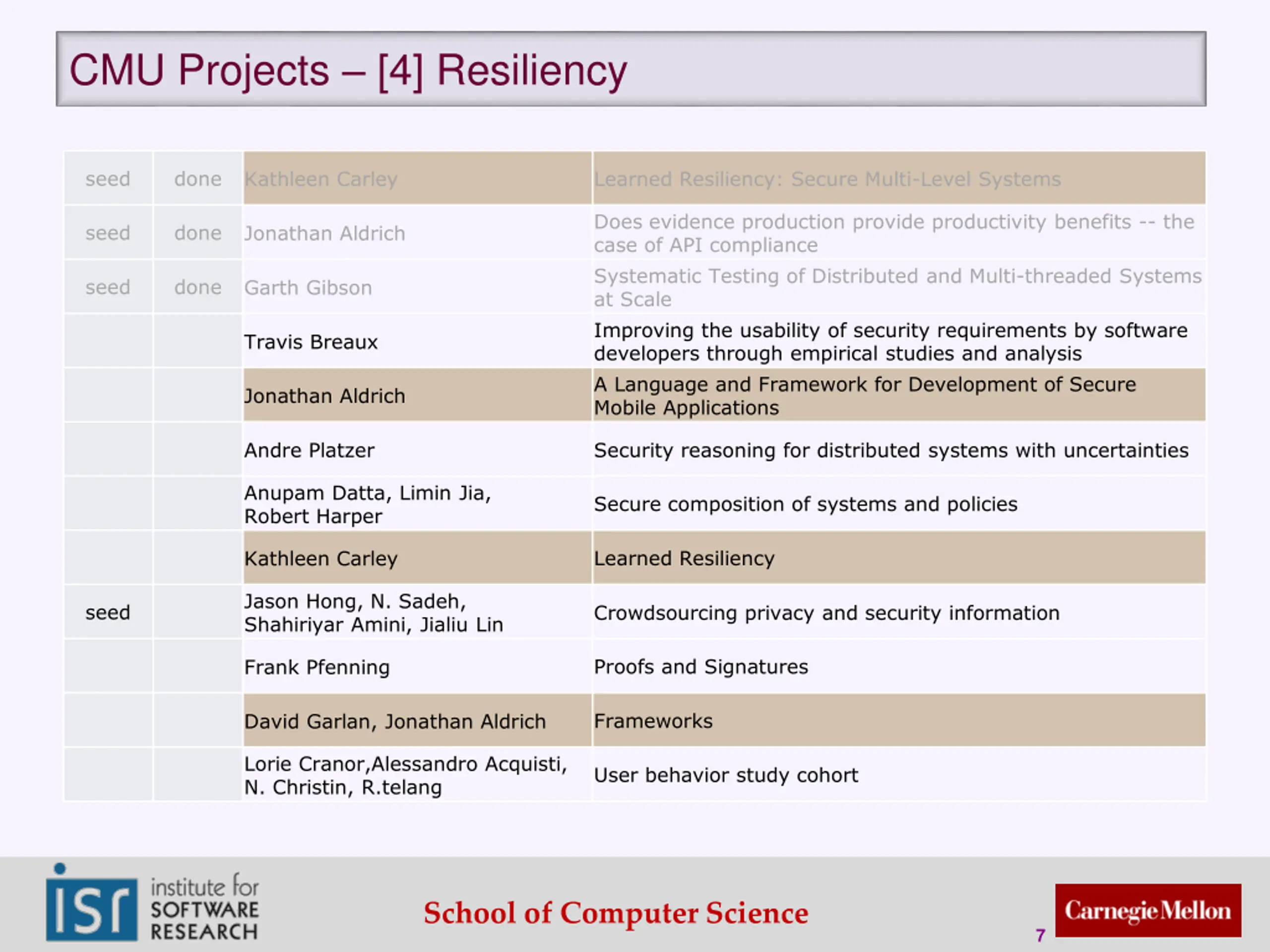 CMU Projects [4] Resiliency seed done Kathleen Carley Learned Resiliency: Secure Multi-Level Systems Does evidence production provide productivity benefits -- the case of API compliance Systematic Testing of Distributed and Multi-threaded Systems at Scale Improving the usability of security requirements by software developers through empirical studies and analysis A Language and Framework for Development of Secure Mobile Applications seed done Jonathan Aldrich seed done Garth Gibson Travis Breaux Jonathan Aldrich Andre Platzer Security reasoning for distributed systems with uncertainties Anupam Datta, Limin Jia, Robert Harper Secure composition of systems and policies Learned Resiliency Kathleen Carley Jason Hong, N. Sadeh, Shahiriyar Amini, Jialiu Lin seed Crowdsourcing privacy and security information Proofs and Signatures Frank Pfenning Frameworks David Garlan, Jonathan Aldrich Lorie Cranor,Alessandro Acquisti, N. Christin, R.telang User behavior study cohort School of Computer Science 7