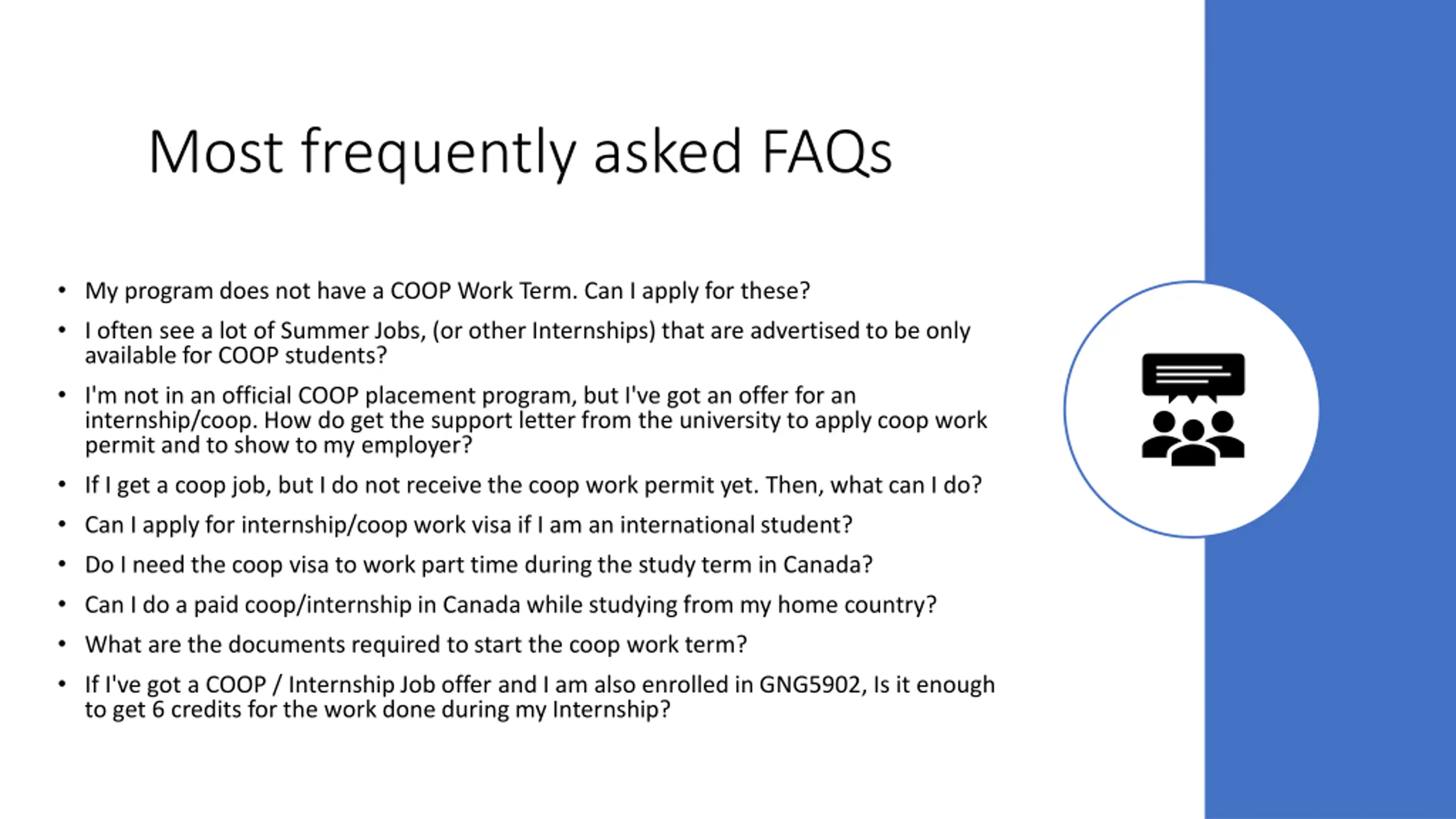 Most frequently asked FAQs My program does not have a COOP Work Term. Can I apply for these? I often see a lot of Summer Jobs, (or other Internships) that are advertised to be only available for COOP students? I'm not in an official COOP placement program, but I've got an offer for an internship/coop. How do get the support letter from the university to apply coop work permit and to show to my employer? If I get a coop job, but I do not receive the coop work permit yet. Then, what can I do? Can I apply for internship/coop work visa if I am an international student? Do I need the coop visa to work part time during the study term in Canada? Can I do a paid coop/internship in Canada while studying from my home country? What are the documents required to start the coop work term? If I've got a COOP / Internship Job offer and I am also enrolled in GNG5902, Is it enough to get 6 credits for the work done during my Internship?