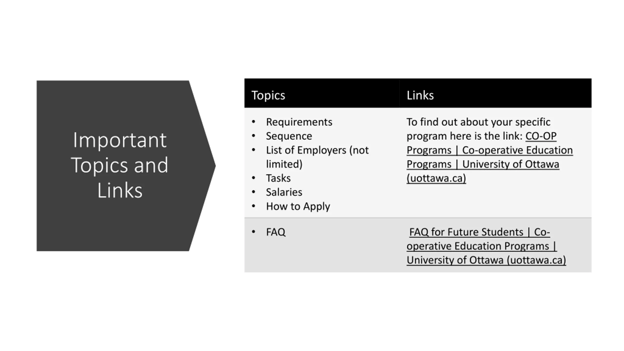 Topics Links Requirements Sequence List of Employers (not limited) Tasks Salaries How to Apply To find out about your specific program here is the link: CO-OP Programs | Co-operative Education Programs | University of Ottawa (uottawa.ca) Important Topics and Links FAQ FAQ for Future Students | Co- operative Education Programs | University of Ottawa (uottawa.ca)
