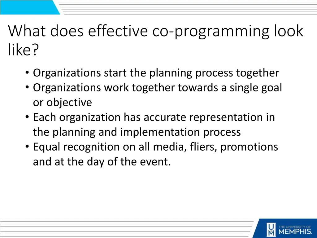 What does effective co-programming look like? Organizations start the planning process together Organizations work together towards a single goal or objective Each organization has accurate representation in the planning and implementation process Equal recognition on all media, fliers, promotions and at the day of the event.