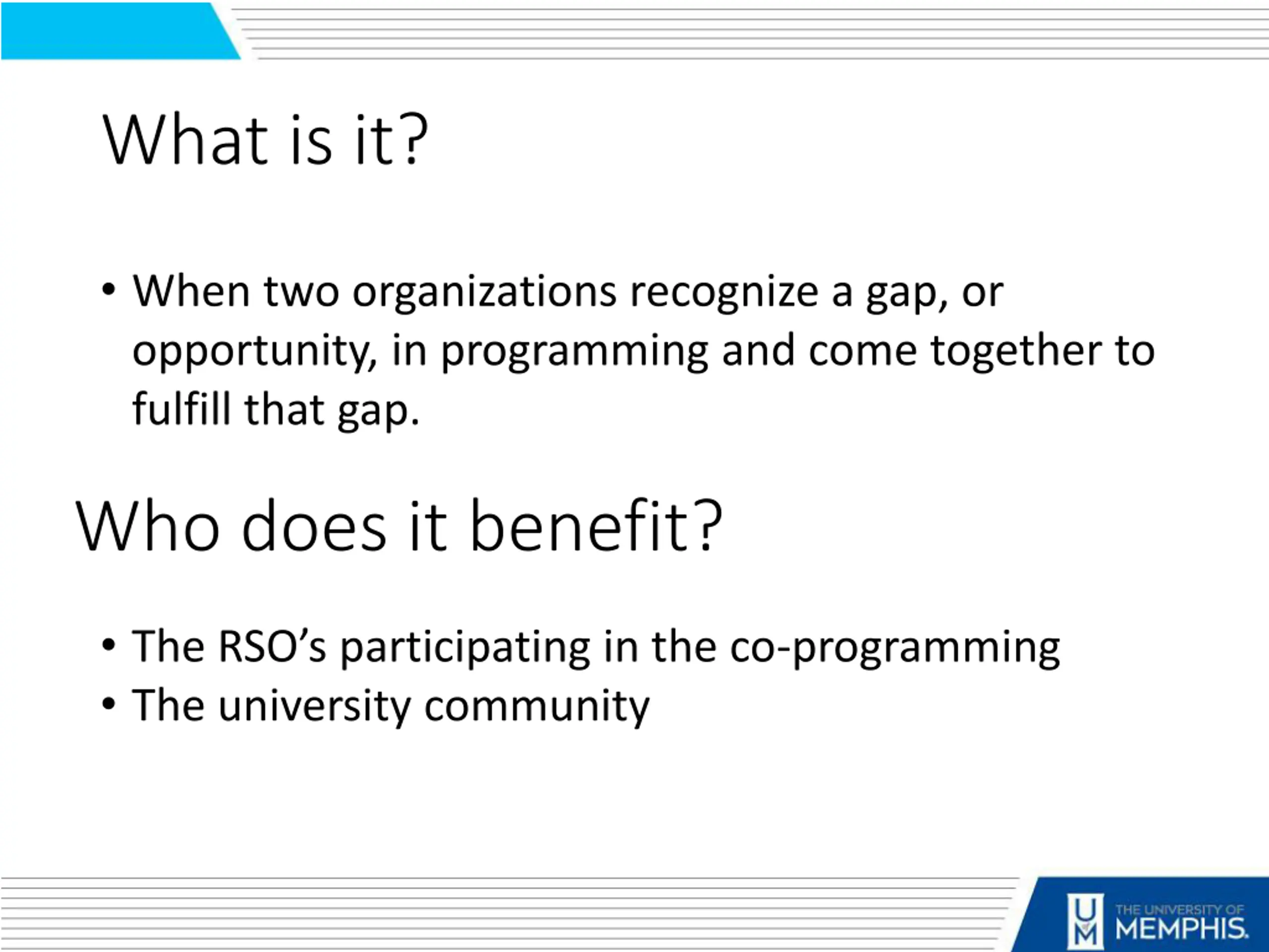 What is it? When two organizations recognize a gap, or opportunity, in programming and come together to fulfill that gap. Who does it benefit? The RSO s participating in the co-programming The university community