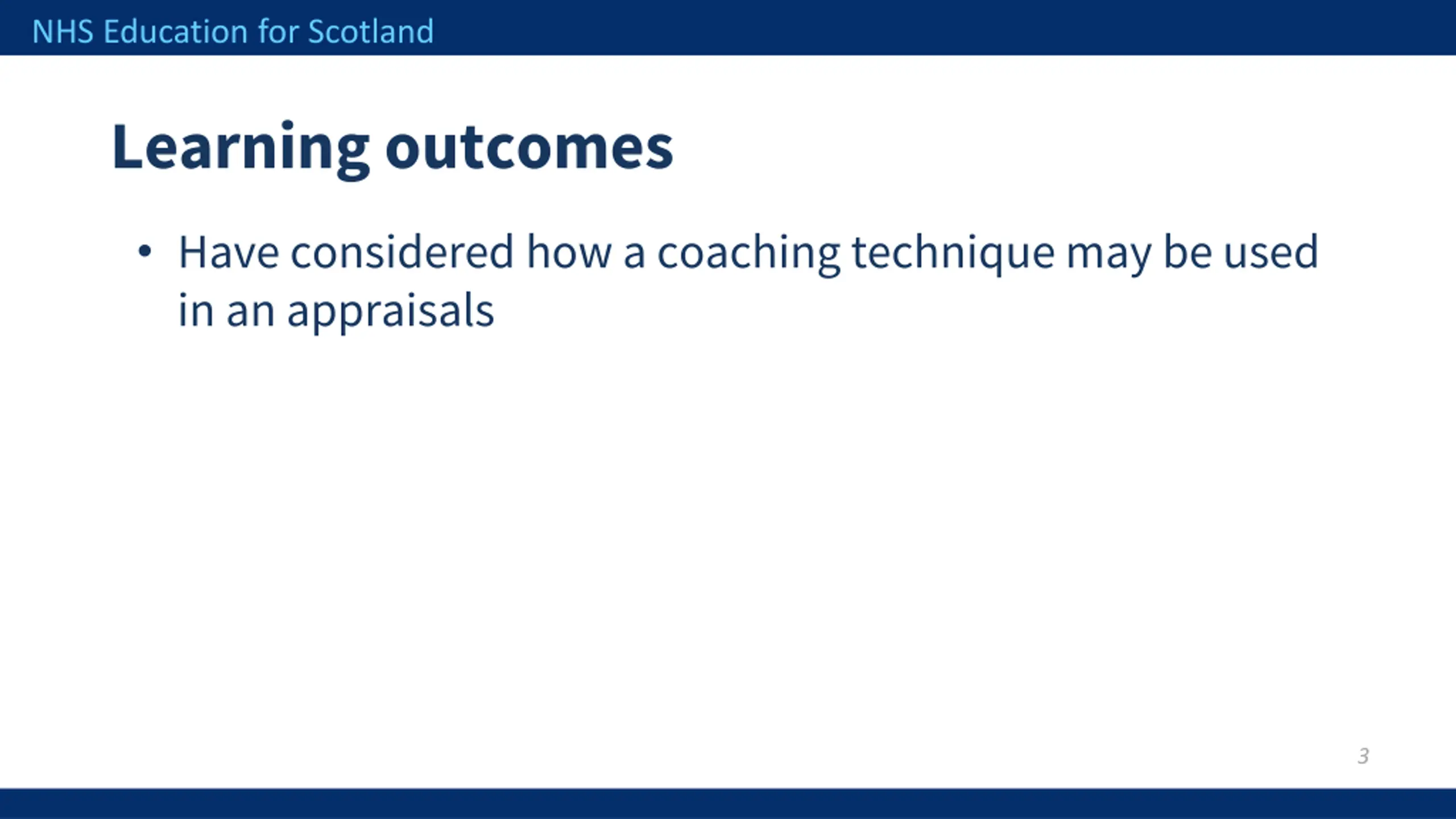 NHS Education for Scotland Aims of this module Awareness of coaching approaches and techniques an appraiser can use in an appraisal discussion NOT training to be a coach 2