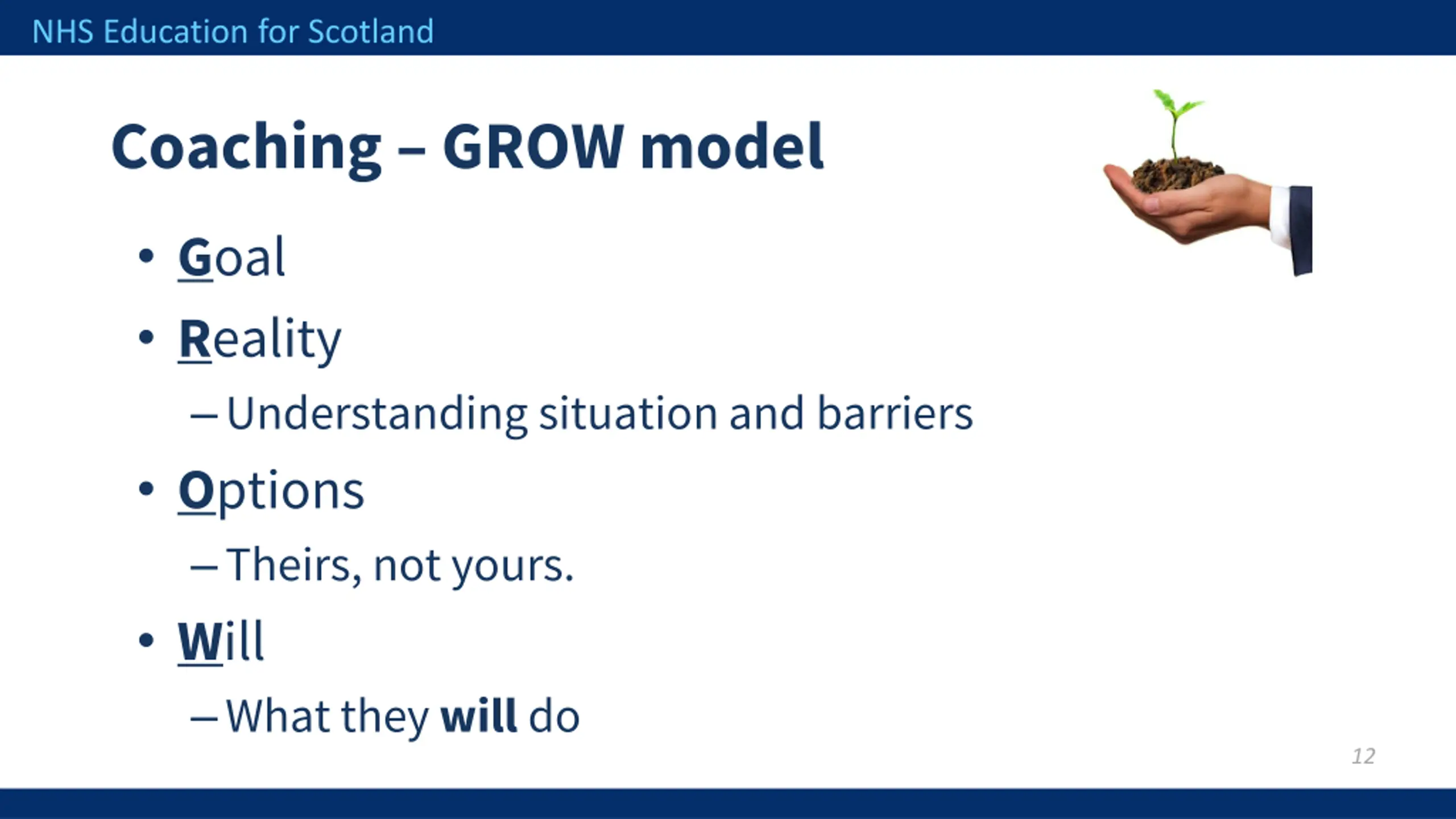 NHS Education for Scotland GROW a model for Coaching Sir John Whitmore Widely accepted Easy to follow Provides structure Achieve conclusions Coaching for Performance Published 1992 - 2002 11