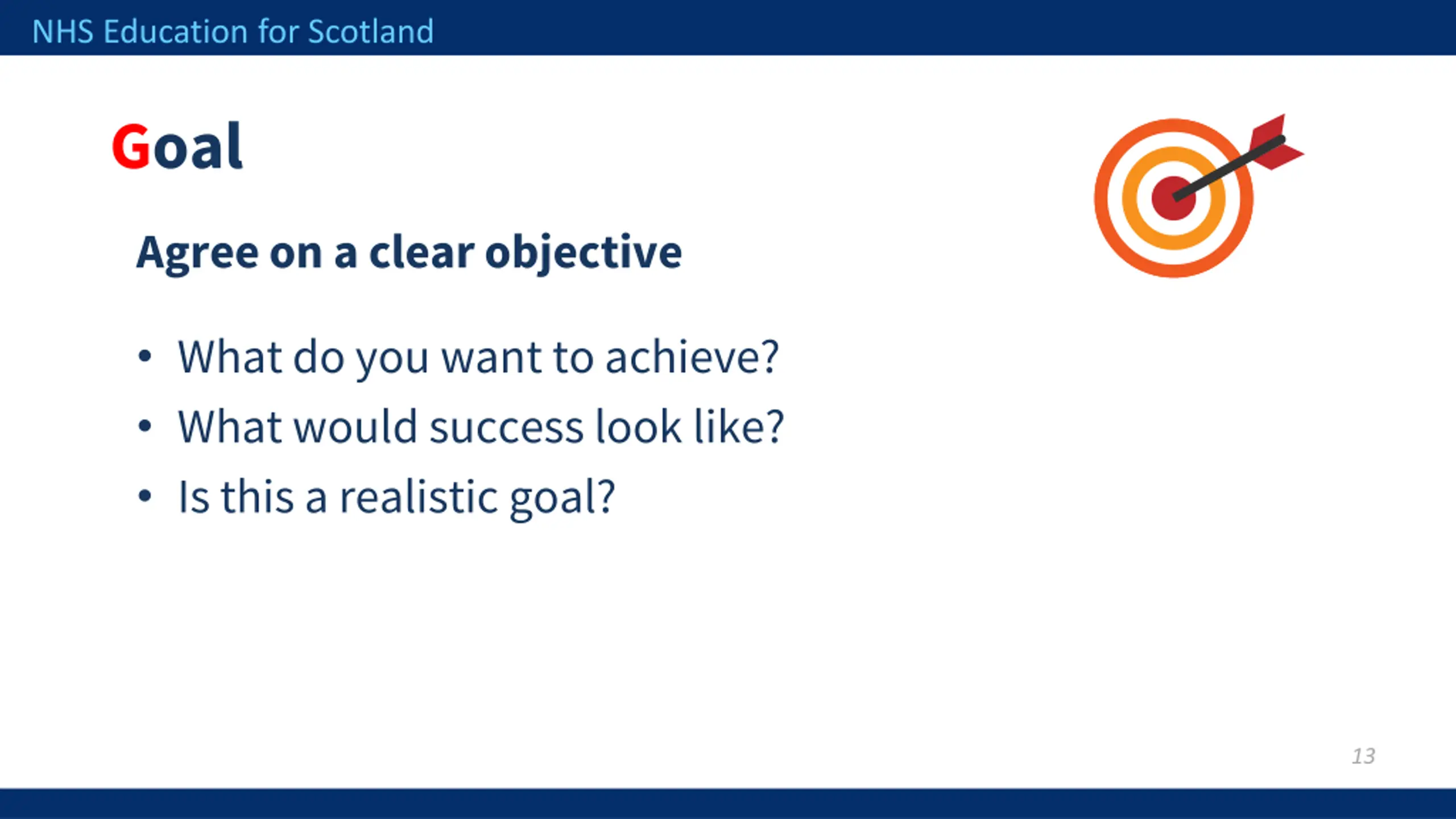 NHS Education for Scotland Coaching GROW model Goal Reality Understanding situation and barriers Options Theirs, not yours. Will What they will do 12