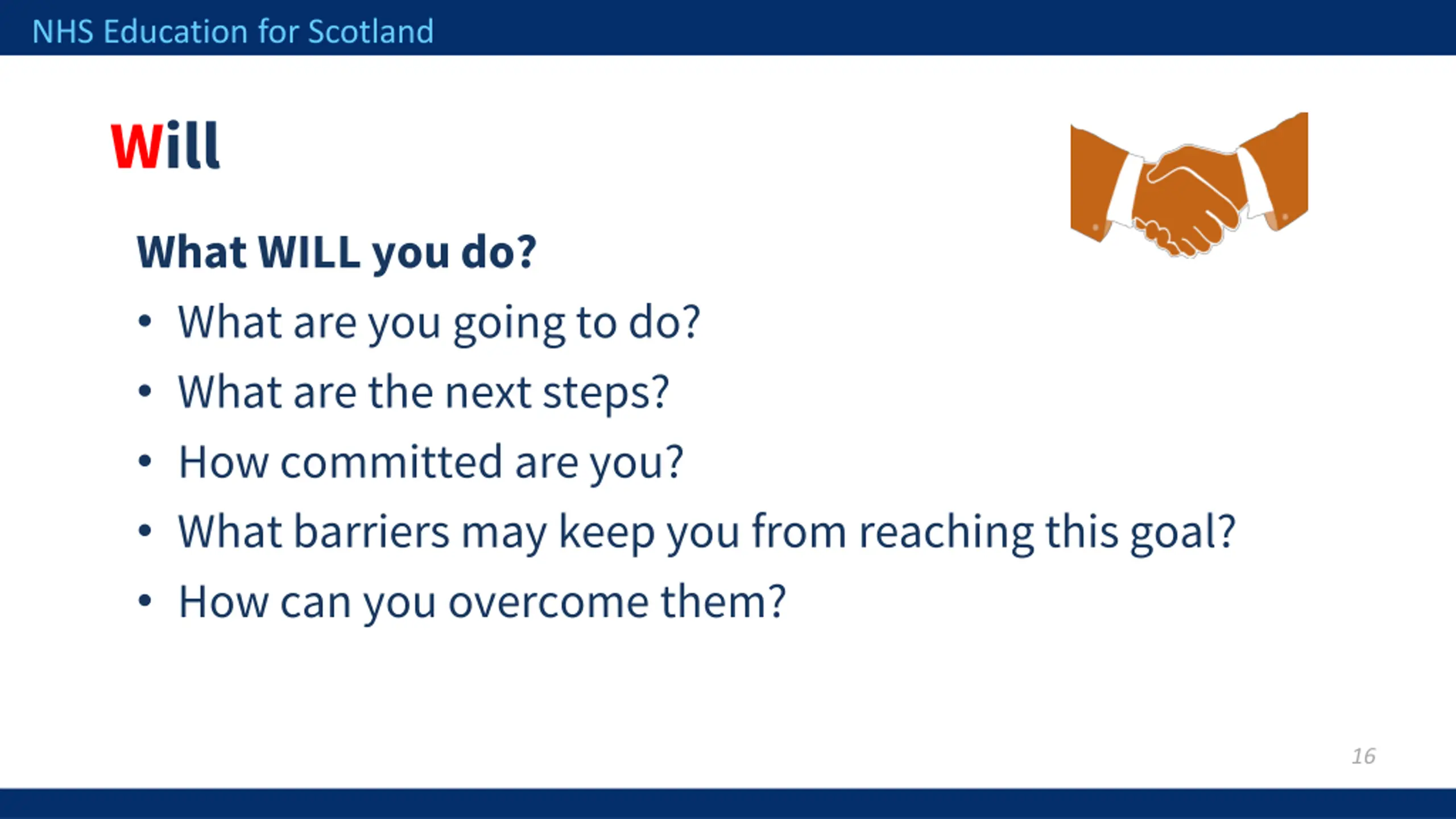 NHS Education for Scotland Will What WILL you do? What are you going to do? What are the next steps? How committed are you? What barriers may keep you from reaching this goal? How can you overcome them? 16