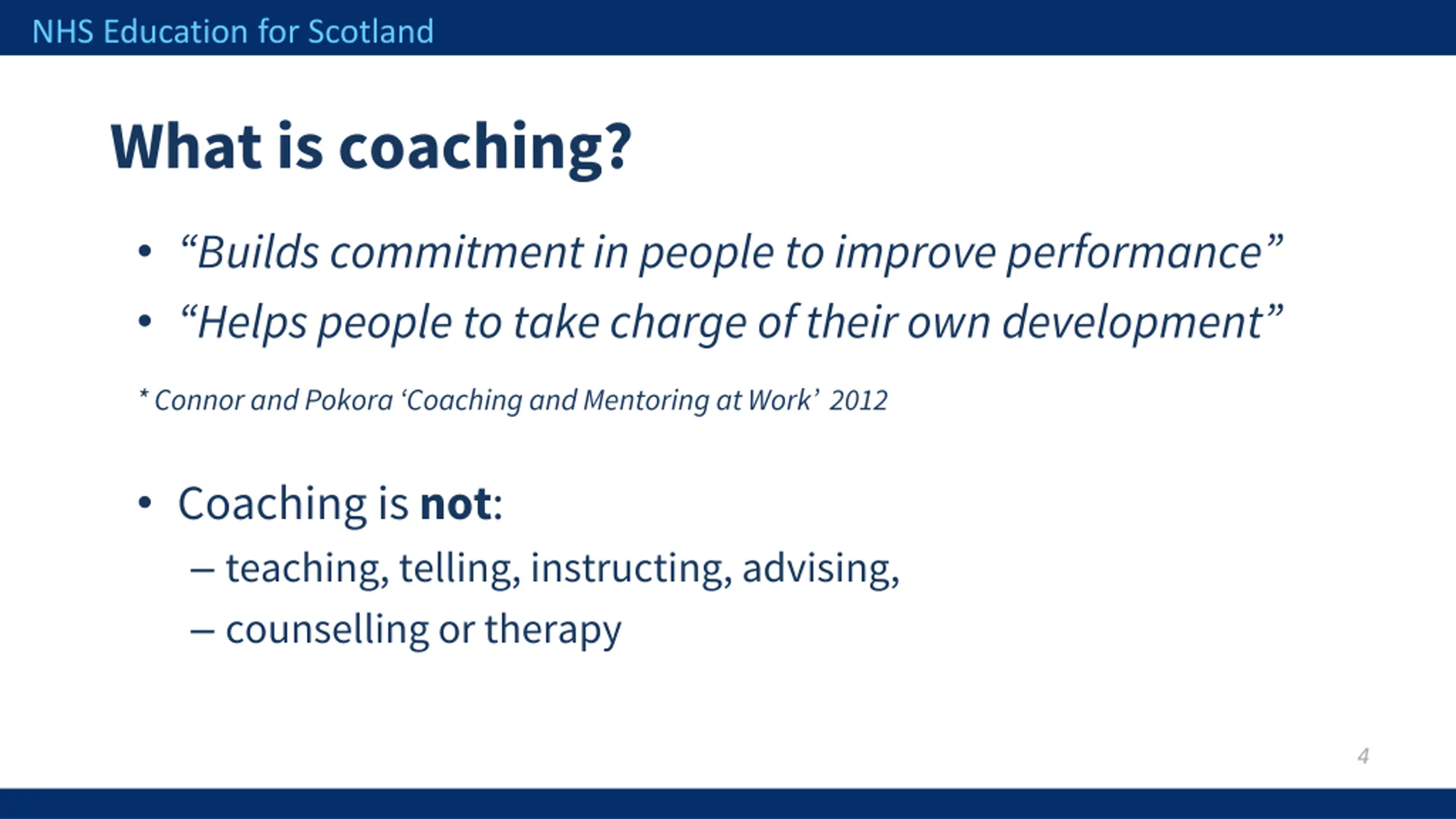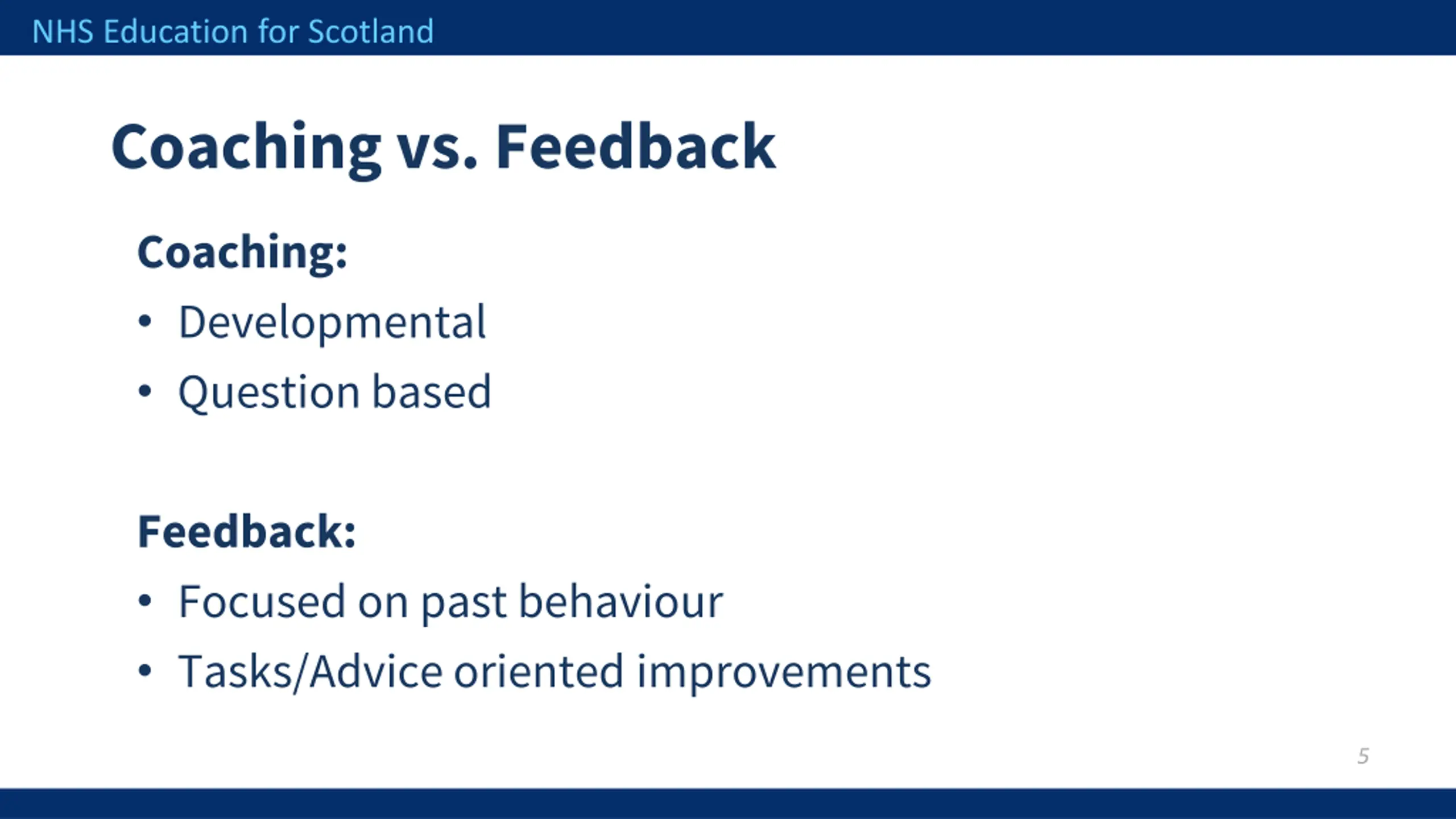 NHS Education for Scotland What is coaching? Builds commitment in people to improve performance Helps people to take charge of their own development * Connor and Pokora Coaching and Mentoring at Work 2012 Coaching is not: teaching, telling, instructing, advising, counselling or therapy 4