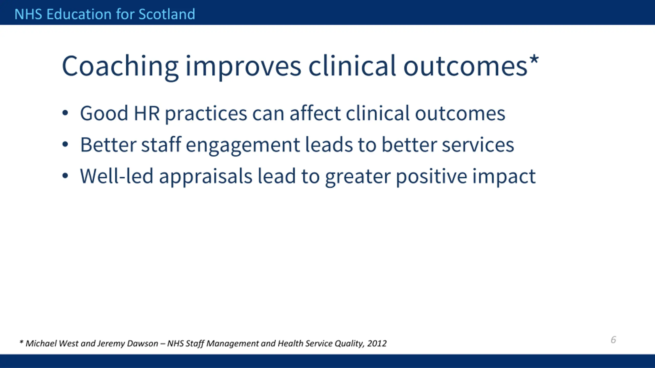 NHS Education for Scotland Coaching vs. Feedback Coaching: Developmental Question based Feedback: Focused on past behaviour Tasks/Advice oriented improvements 5