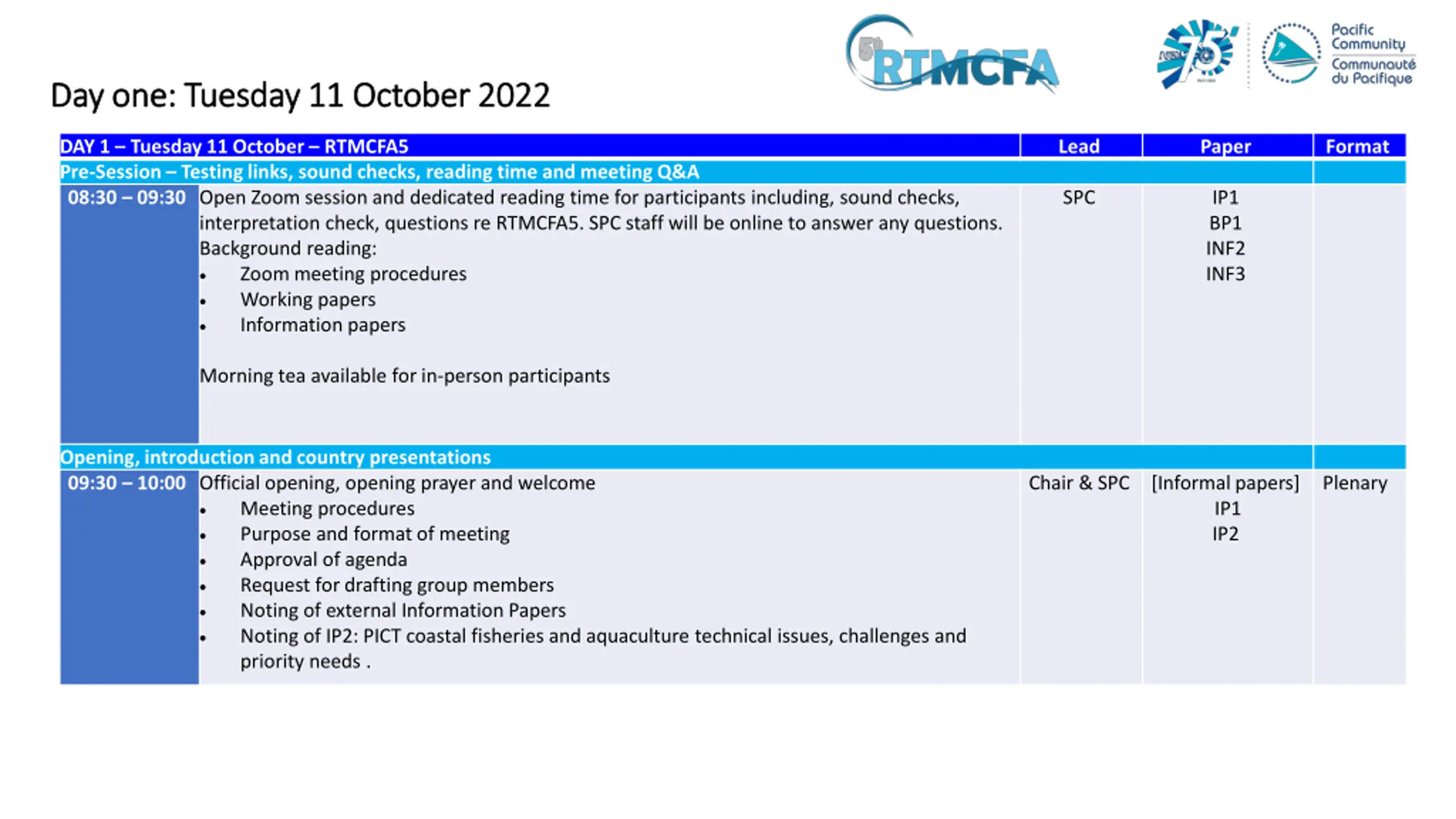 Day one: Tuesday 11 October 2022 Day one: Tuesday 11 October 2022 DAY 1 Tuesday 11 October RTMCFA5 Pre-Session Testing links, sound checks, reading time and meeting Q&A 08:30 09:30 Open Zoom session and dedicated reading time for participants including, sound checks, interpretation check, questions re RTMCFA5. SPC staff will be online to answer any questions. Background reading: Zoom meeting procedures Working papers Information papers Lead Paper Format SPC IP1 BP1 INF2 INF3 Morning tea available for in-person participants Opening, introduction and country presentations 09:30 10:00 Official opening, opening prayer and welcome Meeting procedures Purpose and format of meeting Approval of agenda Request for drafting group members Noting of external Information Papers Noting of IP2: PICT coastal fisheries and aquaculture technical issues, challenges and priority needs . Chair & SPC [Informal papers] IP1 IP2 Plenary
