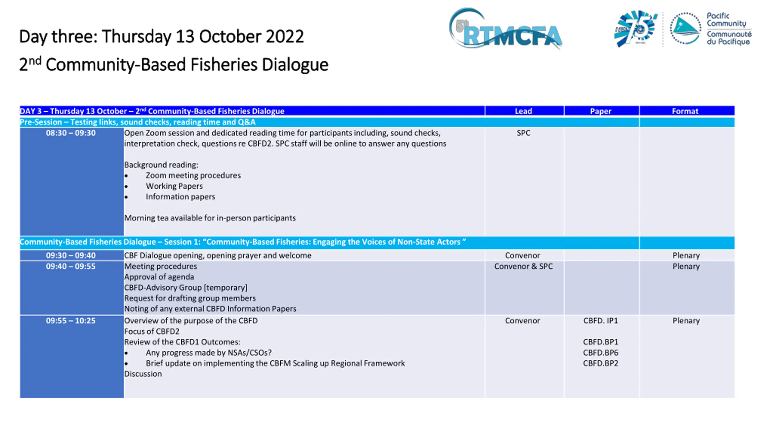 Format and process RTMCFA5 and CBFD2 are hybrid meetings: in-person and virtual Topics identified from priority needs and member requests Each day: Two x 2-hour sessions Each session will have a short presentation on the specific technical issue Breakout group discussions facilitated Plenary discussions and decisions Due to time constraints no observer statements, but Information Papers English: https://fame1.spc.int/en/meetings/261 French: https://fame1.spc.int/fr/meetings/261