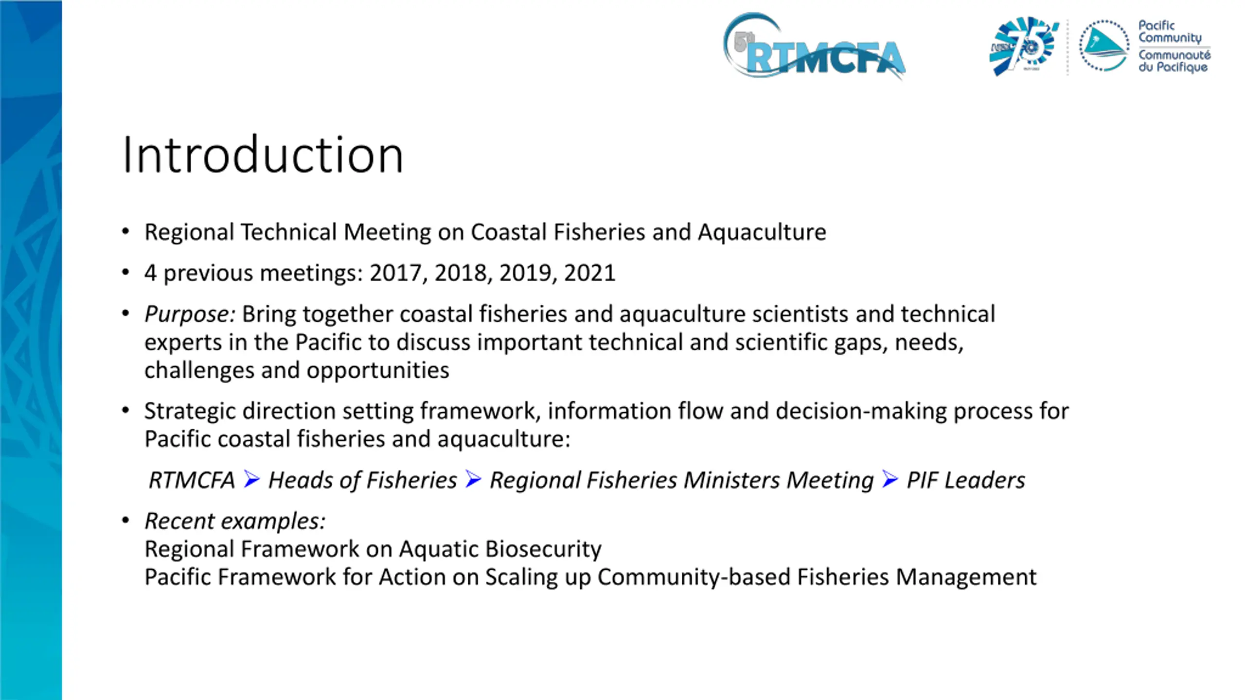 Introduction Regional Technical Meeting on Coastal Fisheries and Aquaculture 4 previous meetings: 2017, 2018, 2019, 2021 Purpose: Bring together coastal fisheries and aquaculture scientists and technical experts in the Pacific to discuss important technical and scientific gaps, needs, challenges and opportunities Strategic direction setting framework, information flow and decision-making process for Pacific coastal fisheries and aquaculture: RTMCFA Heads of Fisheries Regional Fisheries Ministers Meeting PIF Leaders Recent examples: Regional Framework on Aquatic Biosecurity Pacific Framework for Action on Scaling up Community-based Fisheries Management
