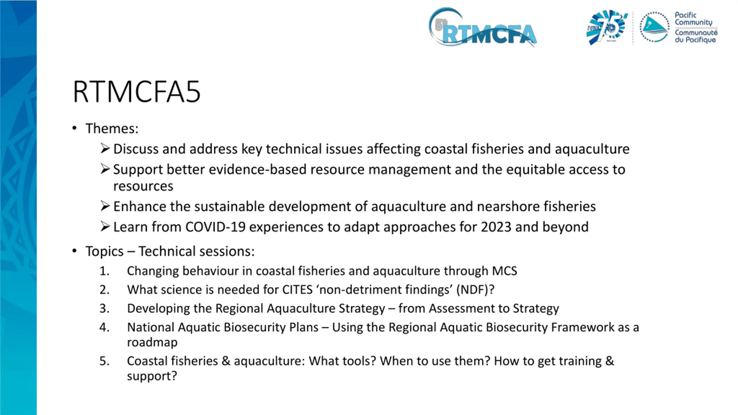 RTMCFA5 Themes: Discuss and address key technical issues affecting coastal fisheries and aquaculture Support better evidence-based resource management and the equitable access to resources Enhance the sustainable development of aquaculture and nearshore fisheries Learn from COVID-19 experiences to adapt approaches for 2023 and beyond Topics Technical sessions: 1. Changing behaviour in coastal fisheries and aquaculture through MCS 2. What science is needed for CITES non-detriment findings (NDF)? 3. Developing the Regional Aquaculture Strategy from Assessment to Strategy 4. National Aquatic Biosecurity Plans Using the Regional Aquatic Biosecurity Framework as a roadmap 5. Coastal fisheries & aquaculture: What tools? When to use them? How to get training & support?
