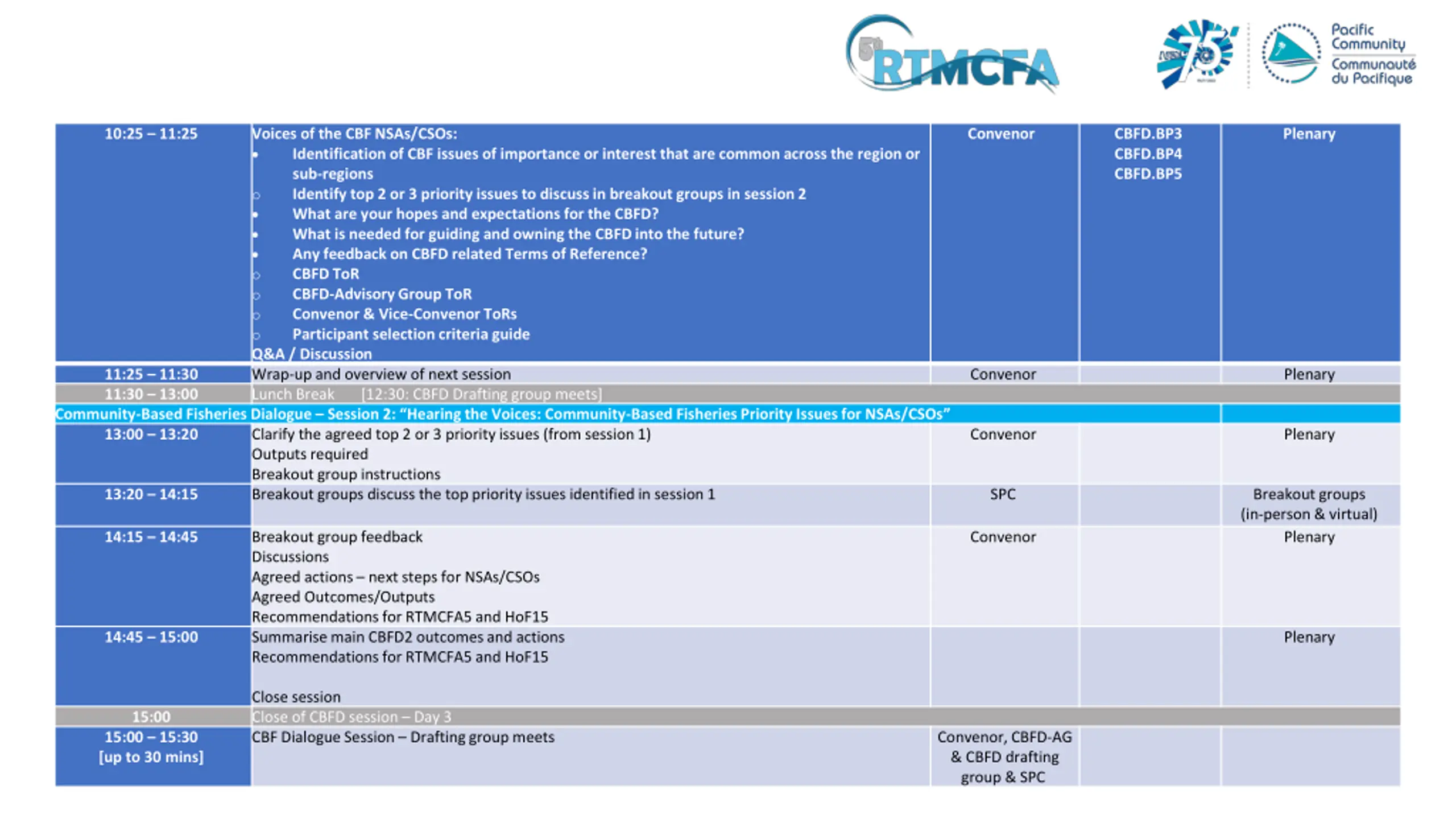 Voices of the CBF NSAs/CSOs: Identification of CBF issues of importance or interest that are common across the region or sub-regions o Identify top 2 or 3 priority issues to discuss in breakout groups in session 2 What are your hopes and expectations for the CBFD? What is needed for guiding and owning the CBFD into the future? Any feedback on CBFD related Terms of Reference? o CBFD ToR o CBFD-Advisory Group ToR o Convenor & Vice-Convenor ToRs o Participant selection criteria guide Q&A / Discussion Wrap-up and overview of next session Lunch Break [12:30: CBFD Drafting group meets] Community-Based Fisheries Dialogue Session 2: Hearing the Voices: Community-Based Fisheries Priority Issues for NSAs/CSOs 13:00 13:20 Clarify the agreed top 2 or 3 priority issues (from session 1) Outputs required Breakout group instructions 13:20 14:15 Breakout groups discuss the top priority issues identified in session 1 10:25 11:25 Convenor CBFD.BP3 CBFD.BP4 CBFD.BP5 Plenary 11:25 11:30 11:30 13:00 Convenor Plenary Convenor Plenary SPC Breakout groups (in-person & virtual) Plenary 14:15 14:45 Breakout group feedback Discussions Agreed actions next steps for NSAs/CSOs Agreed Outcomes/Outputs Recommendations for RTMCFA5 and HoF15 Summarise main CBFD2 outcomes and actions Recommendations for RTMCFA5 and HoF15 Convenor 14:45 15:00 Plenary Close session Close of CBFD session Day 3 CBF Dialogue Session Drafting group meets 15:00 15:00 15:30 [up to 30 mins] Convenor, CBFD-AG & CBFD drafting group & SPC