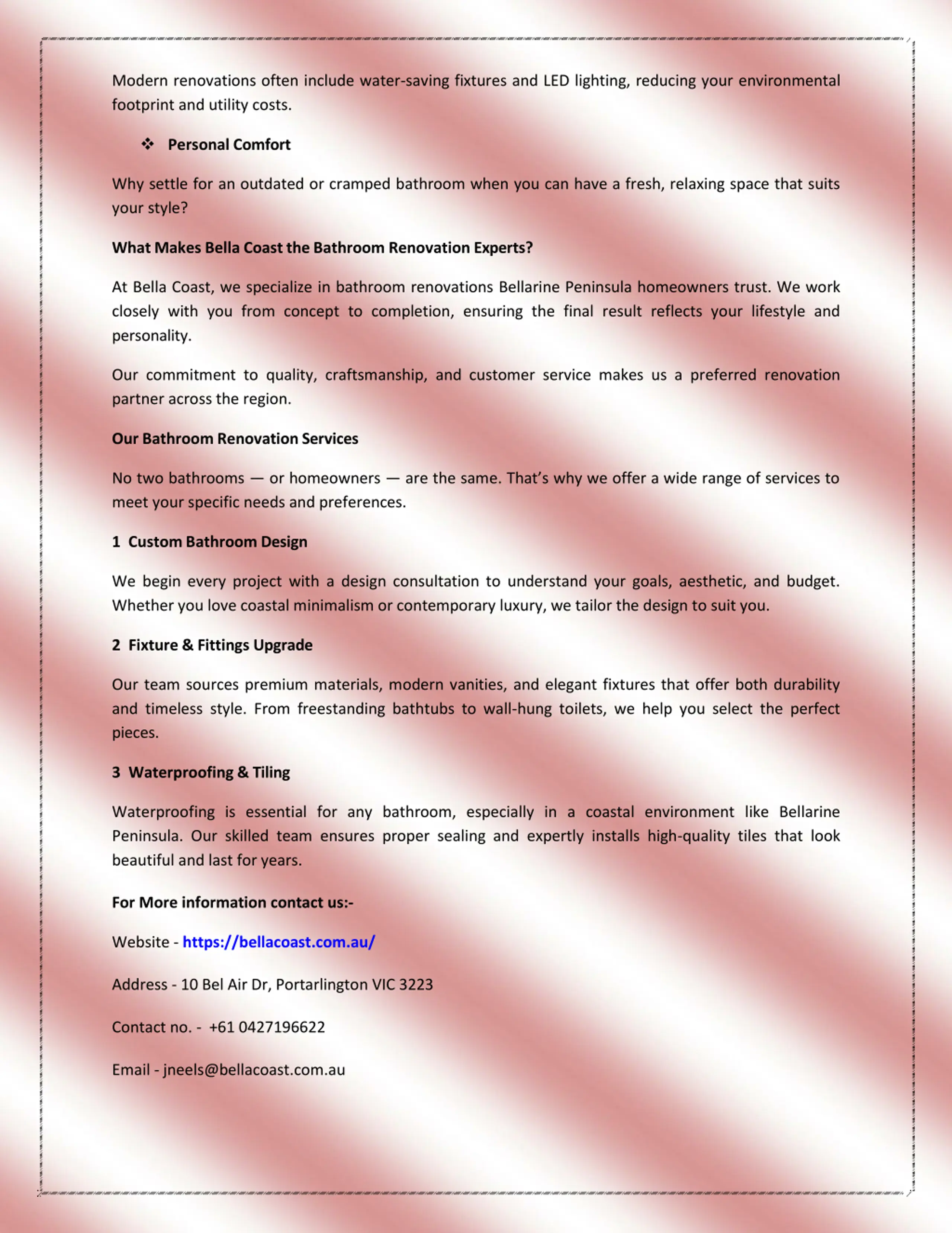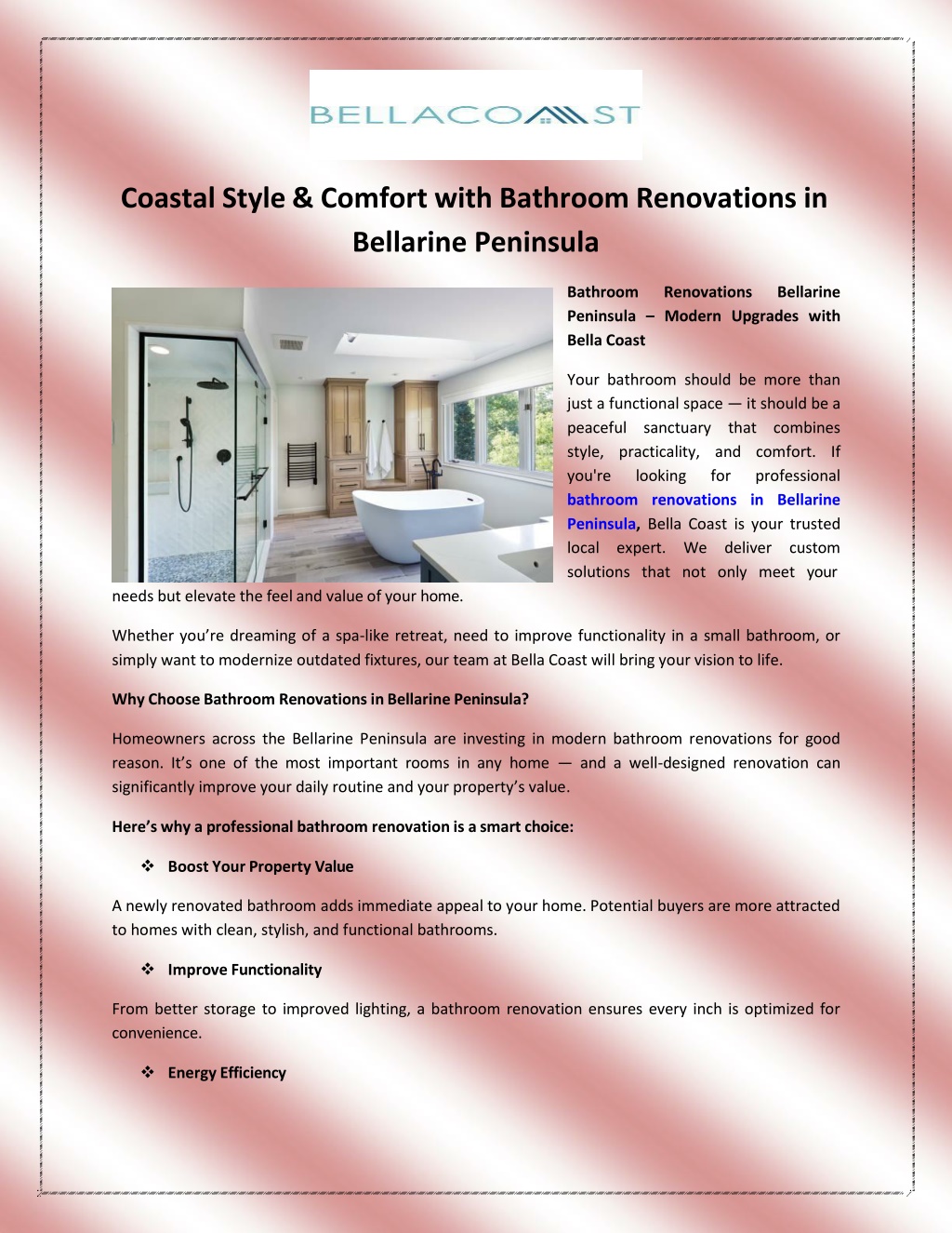 Modern renovations often include water-saving fixtures and LED lighting, reducing your environmental footprint and utility costs. Personal Comfort Why settle for an outdated or cramped bathroom when you can have a fresh, relaxing space that suits your style? What Makes Bella Coast the Bathroom Renovation Experts? At Bella Coast, we specialize in bathroom renovations Bellarine Peninsula homeowners trust. We work closely with you from concept to completion, ensuring the final result reflects your lifestyle and personality. Our commitment to quality, craftsmanship, and customer service makes us a preferred renovation partner across the region. Our Bathroom Renovation Services No two bathrooms or homeowners are the same. That s why we offer a wide range of services to meet your specific needs and preferences. 1Custom Bathroom Design We begin every project with a design consultation to understand your goals, aesthetic, and budget. Whether you love coastal minimalism or contemporary luxury, we tailor the design to suit you. 2Fixture & Fittings Upgrade Our team sources premium materials, modern vanities, and elegant fixtures that offer both durability and timeless style. From freestanding bathtubs to wall-hung toilets, we help you select the perfect pieces. 3Waterproofing & Tiling Waterproofing is essential for any bathroom, especially in a coastal environment like Bellarine Peninsula. Our skilled team ensures proper sealing and expertly installs high-quality tiles that look beautiful and last for years. For More information contact us:- Website - https://bellacoast.com.au/ Address - 10 Bel Air Dr, Portarlington VIC 3223 Contact no. - +61 0427196622 Email - jneels@bellacoast.com.au