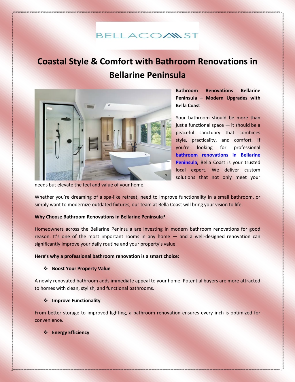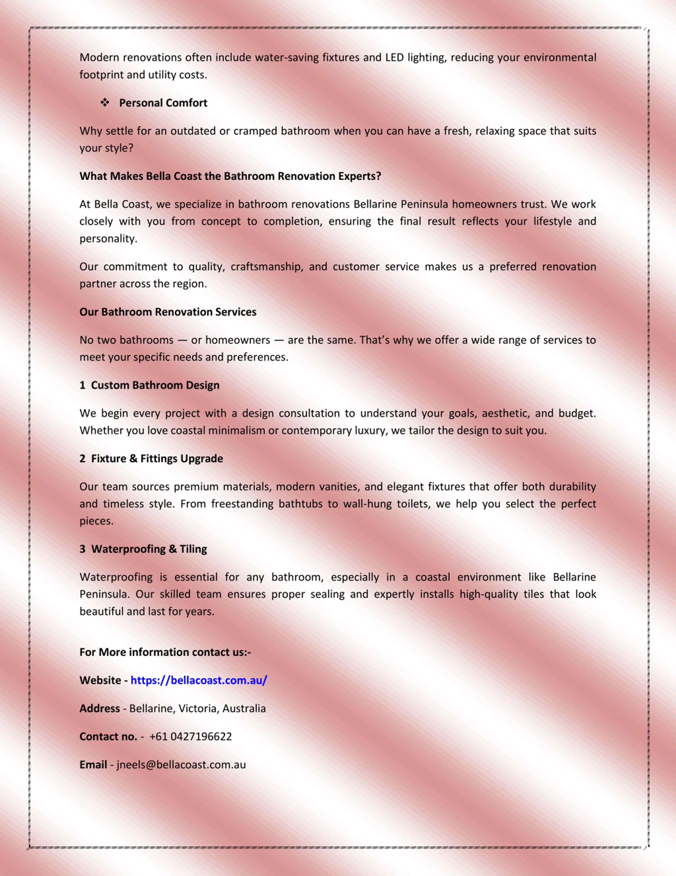 Modern renovations often include water-saving fixtures and LED lighting, reducing your environmental footprint and utility costs. Personal Comfort Why settle for an outdated or cramped bathroom when you can have a fresh, relaxing space that suits your style? What Makes Bella Coast the Bathroom Renovation Experts? At Bella Coast, we specialize in bathroom renovations Bellarine Peninsula homeowners trust. We work closely with you from concept to completion, ensuring the final result reflects your lifestyle and personality. Our commitment to quality, craftsmanship, and customer service makes us a preferred renovation partner across the region. Our Bathroom Renovation Services No two bathrooms or homeowners are the same. That s why we offer a wide range of services to meet your specific needs and preferences. 1 Custom Bathroom Design We begin every project with a design consultation to understand your goals, aesthetic, and budget. Whether you love coastal minimalism or contemporary luxury, we tailor the design to suit you. 2 Fixture & Fittings Upgrade Our team sources premium materials, modern vanities, and elegant fixtures that offer both durability and timeless style. From freestanding bathtubs to wall-hung toilets, we help you select the perfect pieces. 3 Waterproofing & Tiling Waterproofing is essential for any bathroom, especially in a coastal environment like Bellarine Peninsula. Our skilled team ensures proper sealing and expertly installs high-quality tiles that look beautiful and last for years. For More information contact us:- Website- https://bellacoast.com.au/ Address - Bellarine, Victoria, Australia Contact no. - +61 0427196622 Email - jneels@bellacoast.com.au