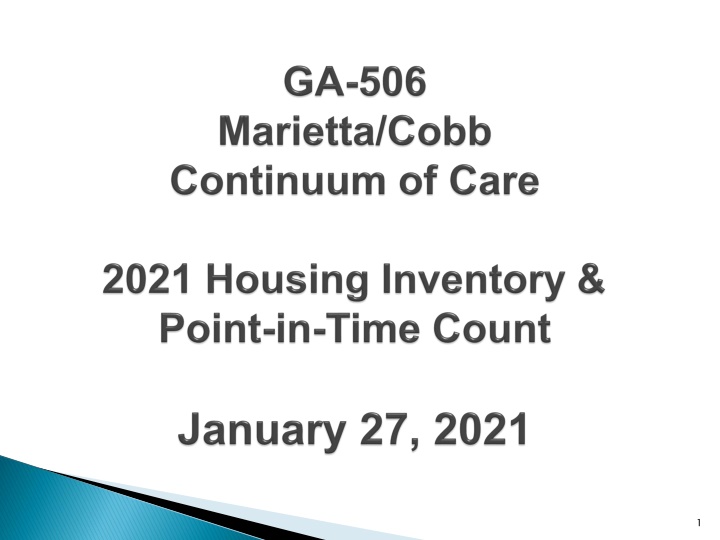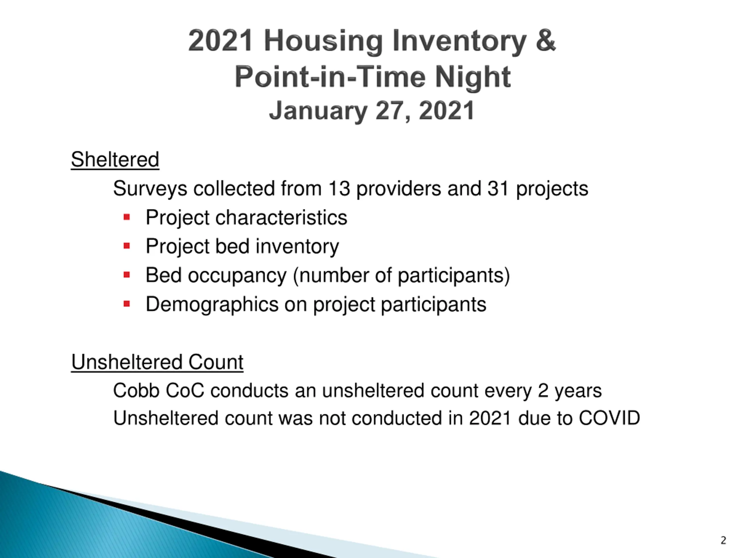 Sheltered Surveys collected from 13 providers and 31 projects Project characteristics Project bed inventory Bed occupancy (number of participants) Demographics on project participants Unsheltered Count Cobb CoC conducts an unsheltered count every 2 years Unsheltered count was not conducted in 2021 due to COVID 2