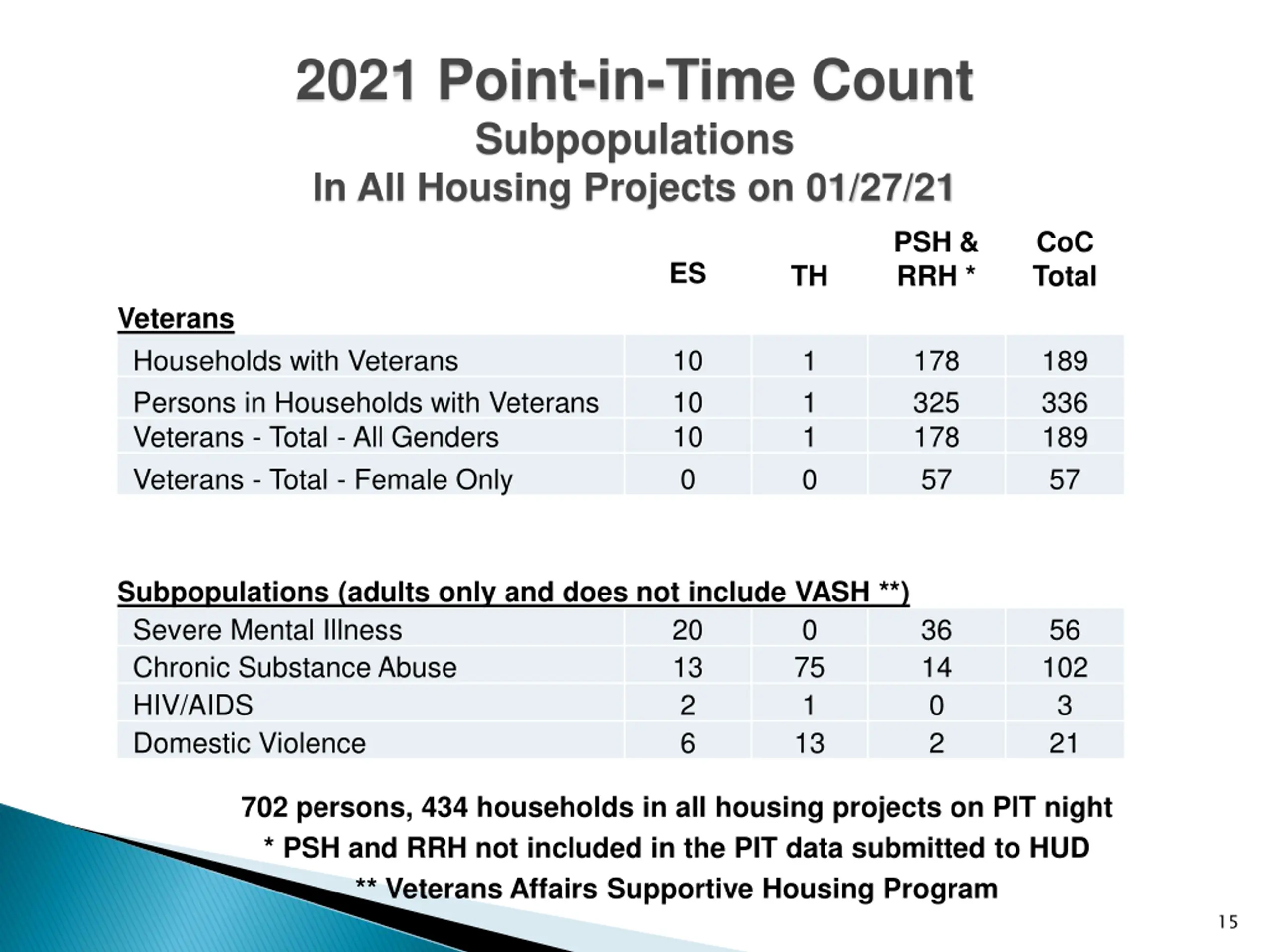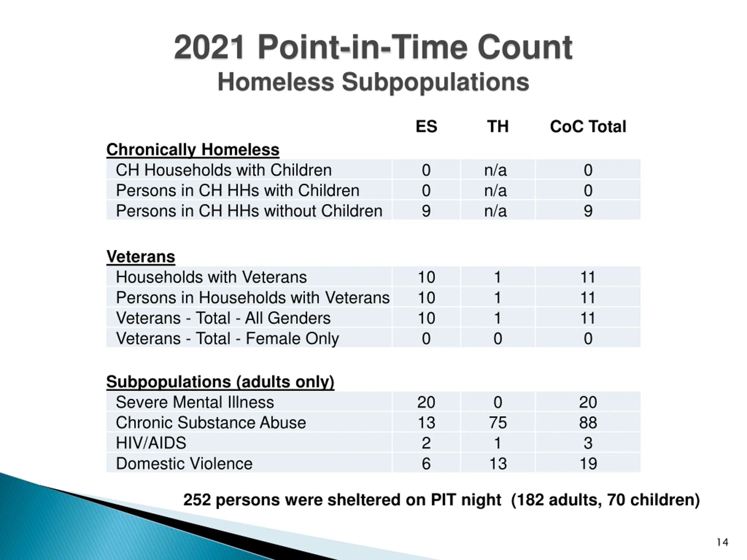 2021 Point-in-Time Count Homeless Subpopulations ES TH CoC Total Chronically Homeless CH Households with Children Persons in CH HHs with Children Persons in CH HHs without Children 0 0 9 n/a n/a n/a 0 0 9 Veterans Households with Veterans Persons in Households with Veterans Veterans - Total - All Genders Veterans - Total - Female Only 10 10 10 0 1 1 1 0 11 11 11 0 Subpopulations (adults only) Severe Mental Illness Chronic Substance Abuse HIV/AIDS Domestic Violence 20 13 2 6 0 75 1 13 20 88 3 19 252 persons were sheltered on PIT night (182 adults, 70 children) 14