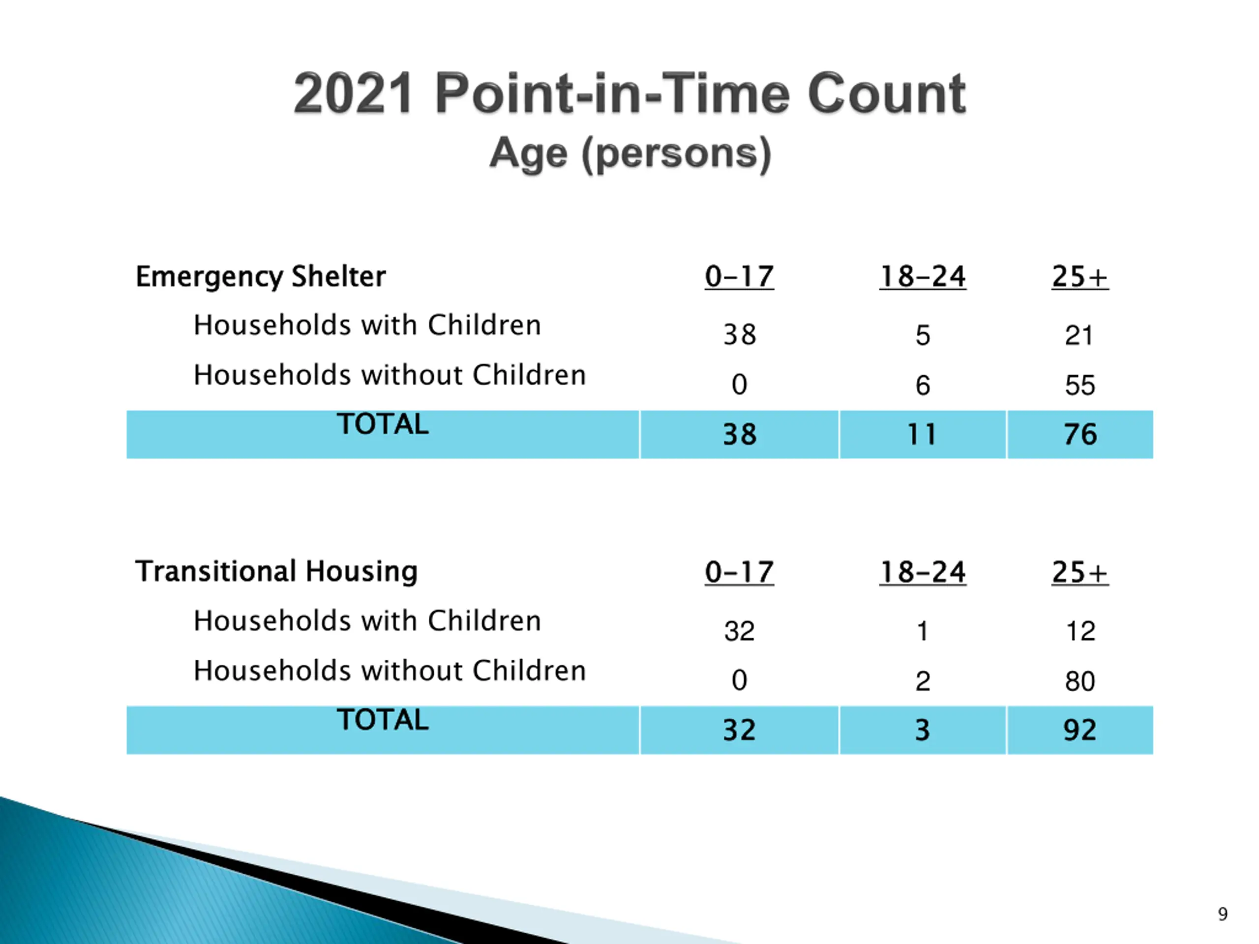 Emergency Shelter Households with Children Households without Children TOTAL Emergency Shelter Households Households Persons Persons Ave HH Size Ave HH Size 19 64 3.4 61 80 61 125 TOTAL 80 125 Transitional Housing Households with Children Households without Children TOTAL Transitional Housing Households 12 82 94 Households Persons Persons Ave HH Size Ave HH Size 45 3.8 82 127 TOTAL 94 127 8