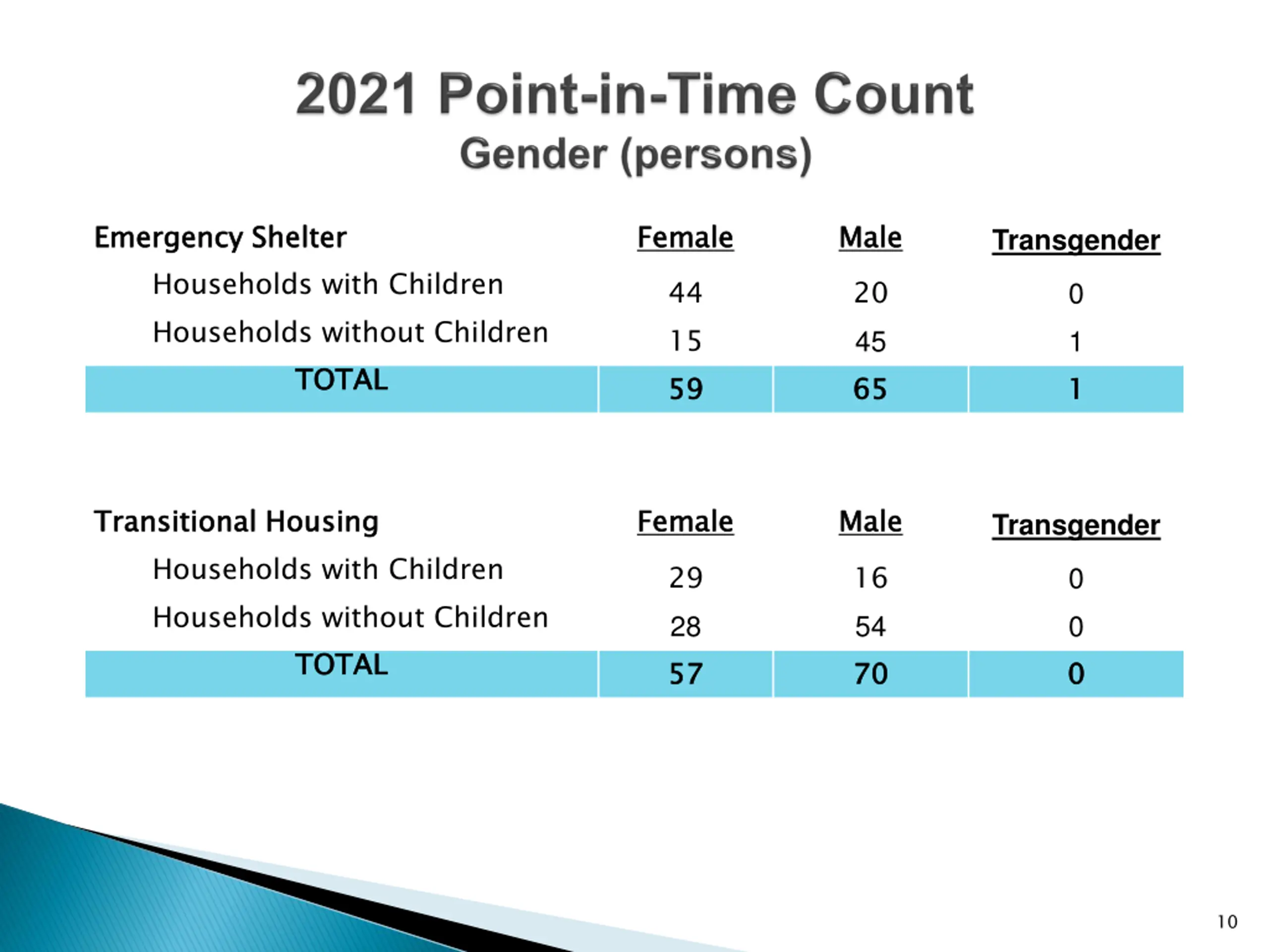 Emergency Shelter Households with Children Households without Children TOTAL Emergency Shelter Female 44 15 59 Female Male 20 45 65 Male Transgender 0 1 1 1 TOTAL 59 65 Transitional Housing Transitional Housing Households with Children Households without Children TOTAL Female 29 28 57 Female Male 16 54 70 Male Transgender 0 0 0 0 TOTAL 57 70 10
