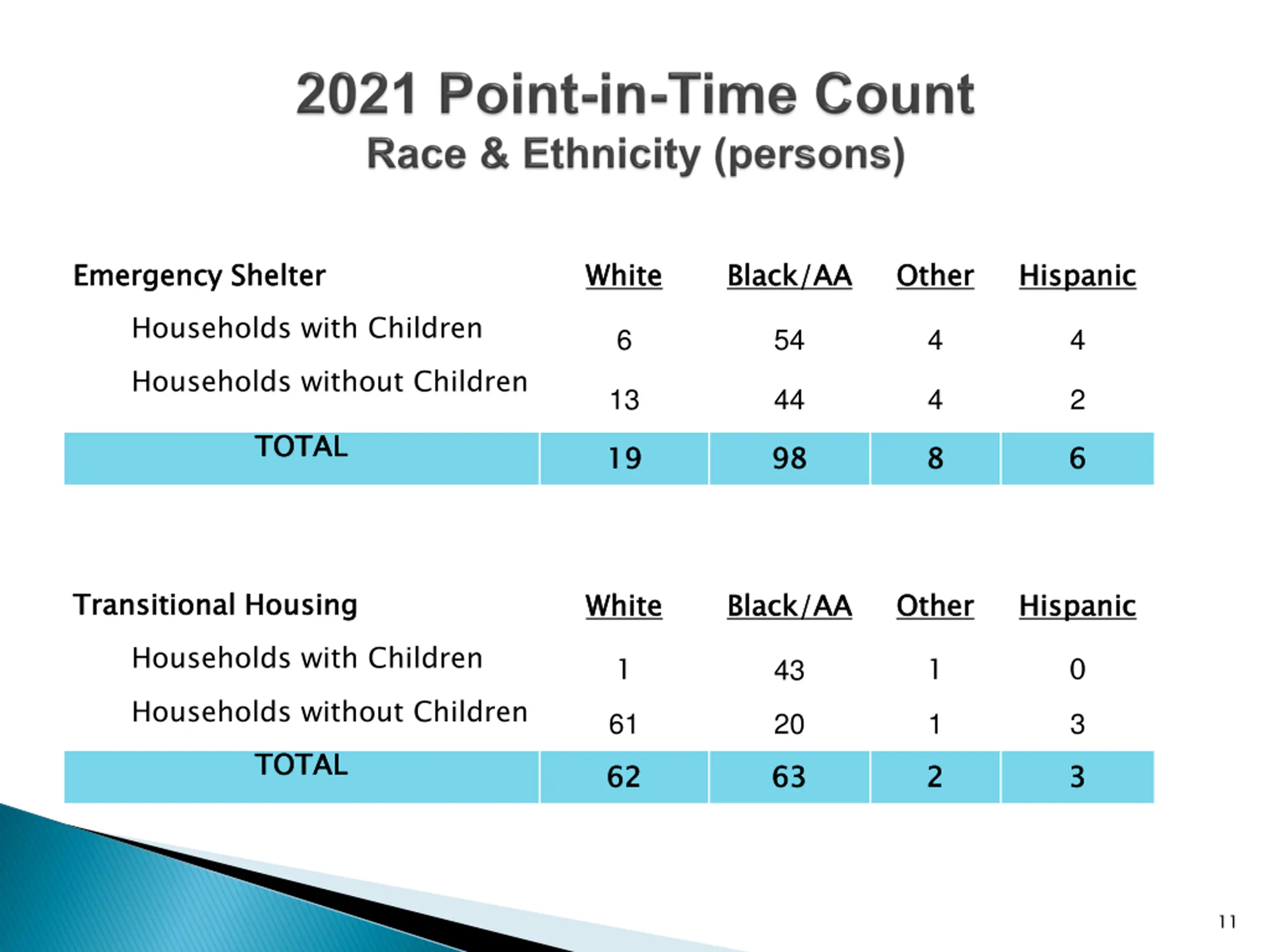 Emergency Shelter Households with Children Households without Children Emergency Shelter White White Black/AA Black/AA Other Other Hispanic Hispanic 6 54 4 4 13 44 4 2 TOTAL TOTAL 19 19 98 98 8 8 6 6 Transitional Housing Households with Children Households without Children TOTAL Transitional Housing White White Black/AA Black/AA Other Other Hispanic Hispanic 1 1 0 43 61 20 1 3 TOTAL 62 62 63 63 2 2 3 3 11