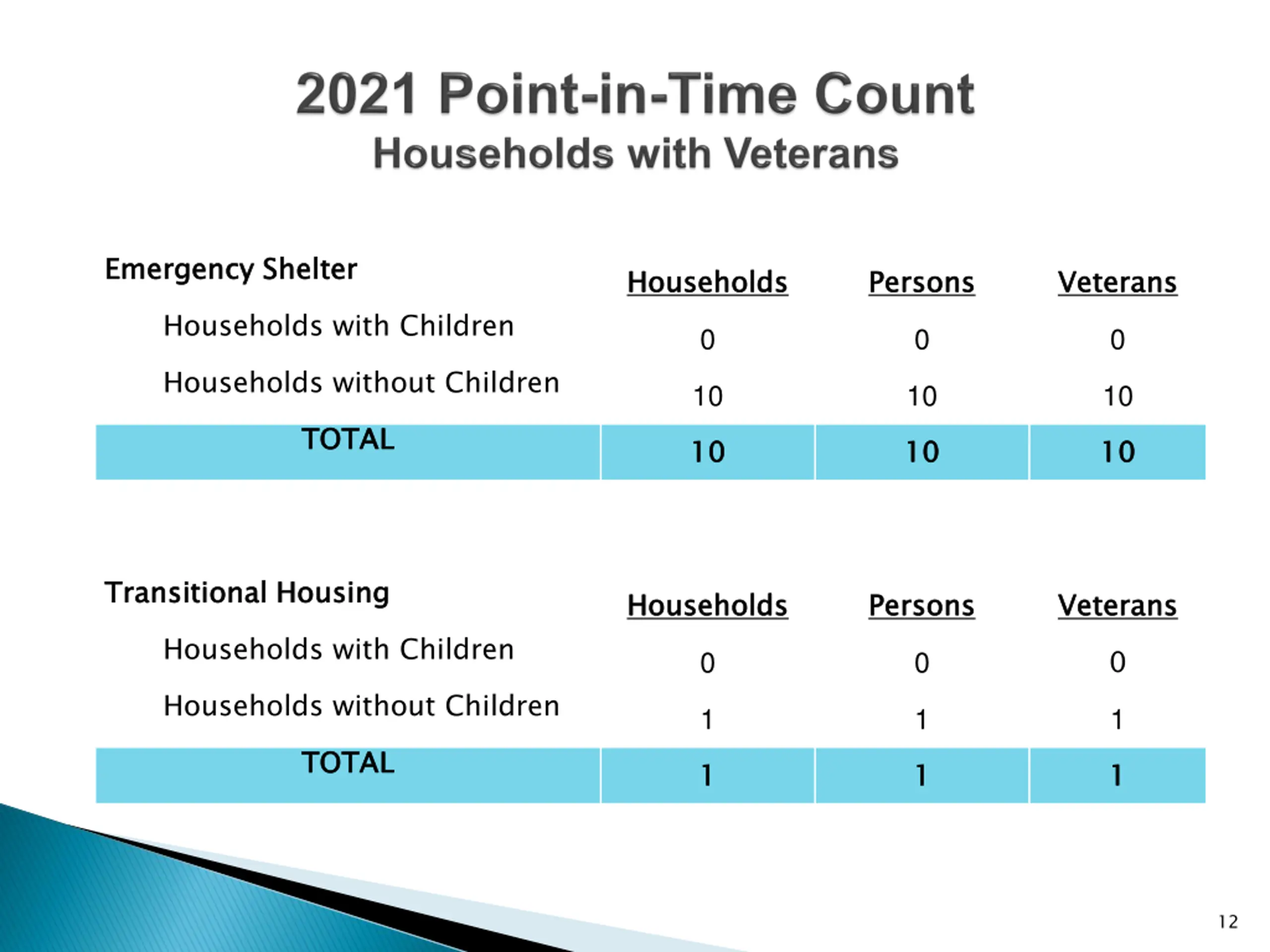 Emergency Shelter Households with Children Households without Children TOTAL Emergency Shelter Households Households Persons Persons Veterans Veterans 0 0 0 10 10 10 TOTAL 10 10 10 10 10 10 Transitional Housing Households with Children Households without Children TOTAL Transitional Housing Households Households Persons Persons Veterans 0 Veterans 0 0 1 1 1 TOTAL 1 1 1 1 1 1 12