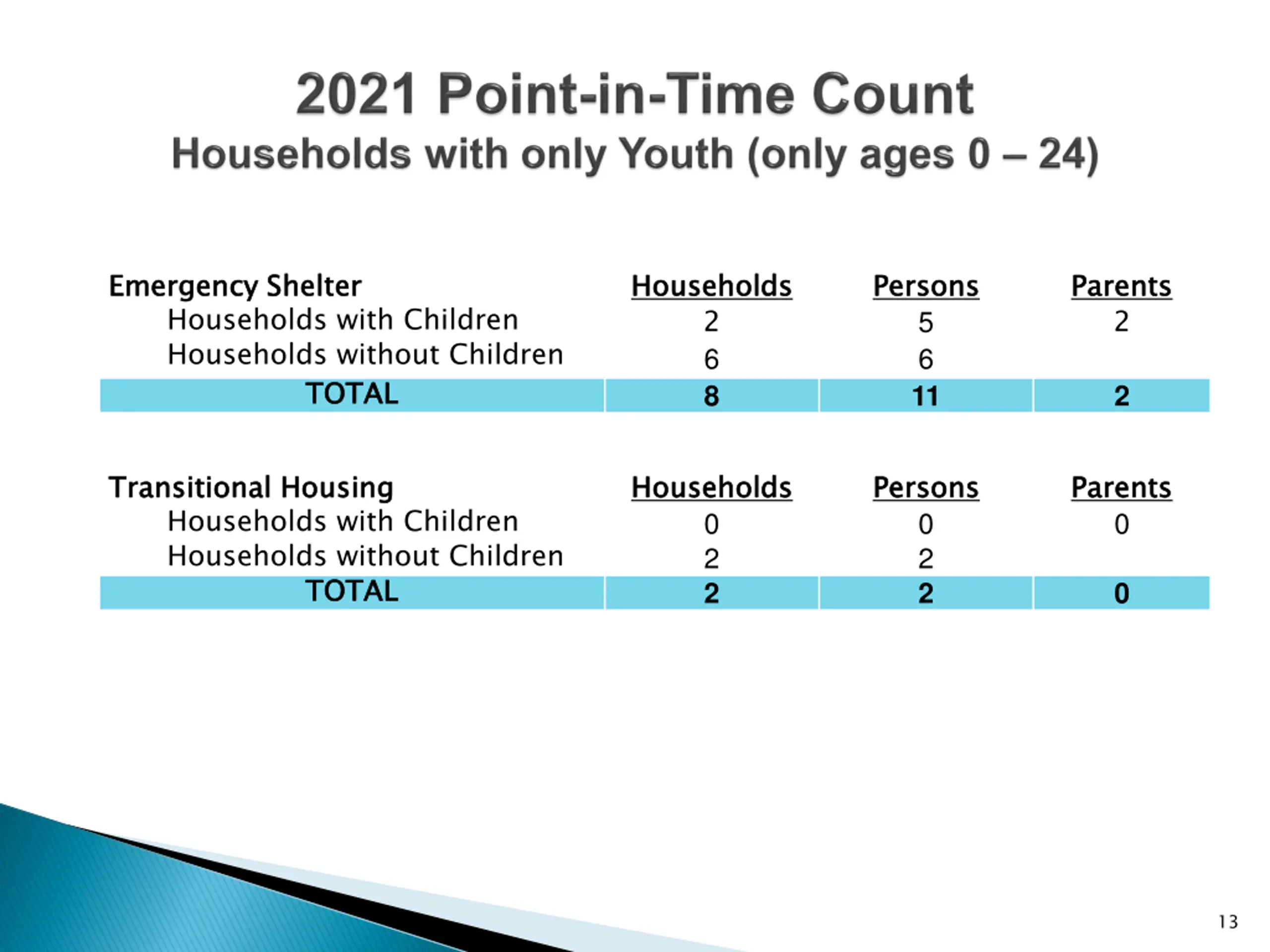 Emergency Shelter Households with Children Households without Children TOTAL Emergency Shelter Households 2 6 8 Households Persons 5 6 11 Persons Parents 2 Parents TOTAL 2 Transitional Housing Households with Children Households without Children TOTAL Transitional Housing Households 0 2 2 Households Persons 0 2 2 Persons Parents 0 Parents TOTAL 0 13