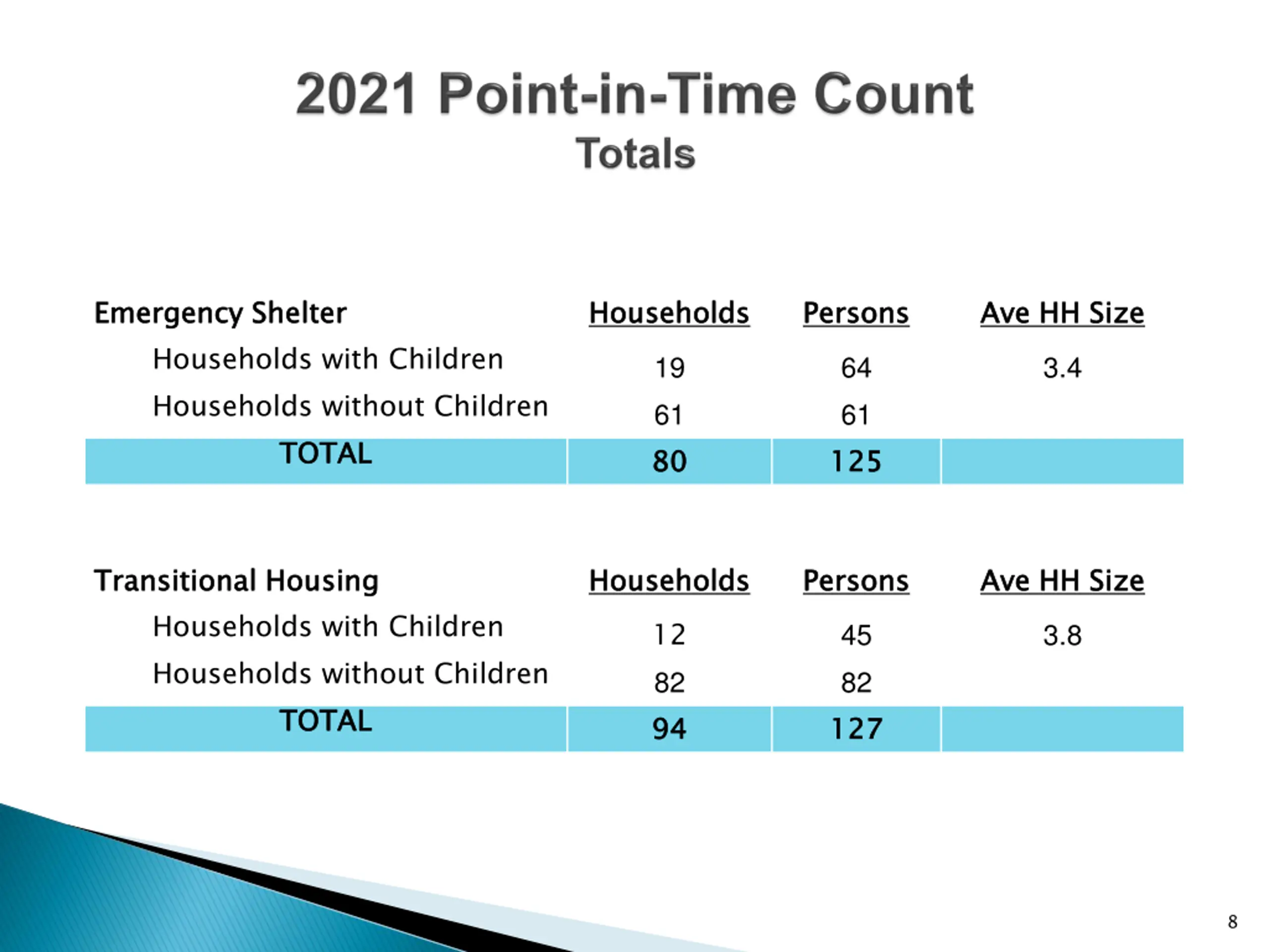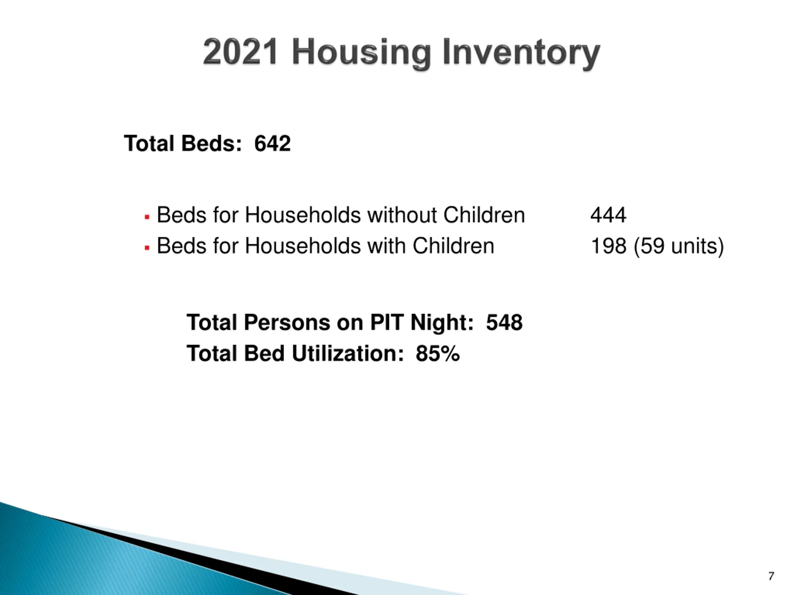 Total Beds: 642 Beds for Households without Children Beds for Households with Children 444 198 (59 units) Total Persons on PIT Night: 548 Total Bed Utilization: 85% 7