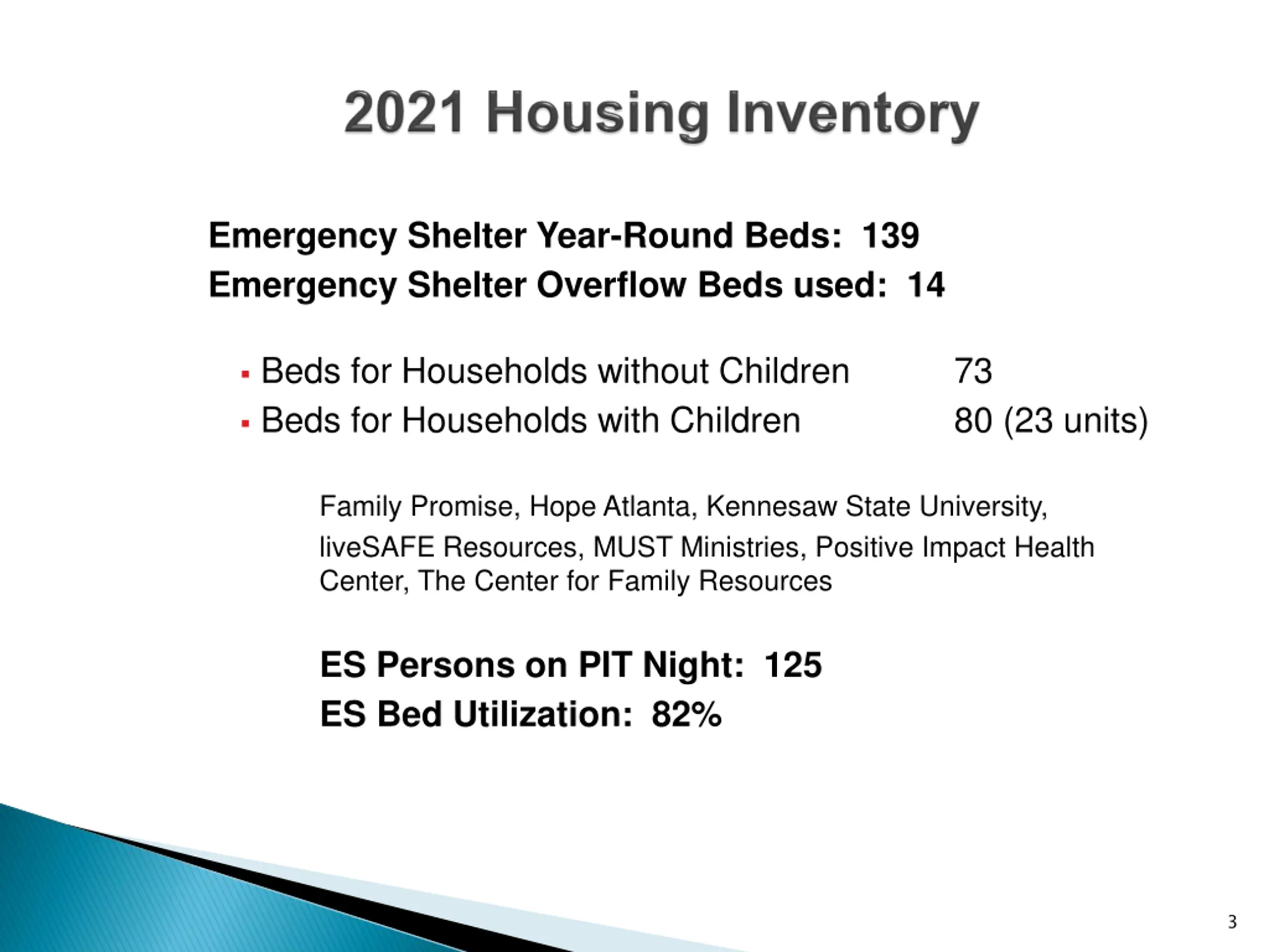 Emergency Shelter Year-Round Beds: 139 Emergency Shelter Overflow Beds used: 14 Beds for Households without Children Beds for Households with Children Family Promise, Hope Atlanta, Kennesaw State University, liveSAFE Resources, MUST Ministries, Positive Impact Health Center, The Center for Family Resources 73 80 (23 units) ES Persons on PIT Night: 125 ES Bed Utilization: 82% 3
