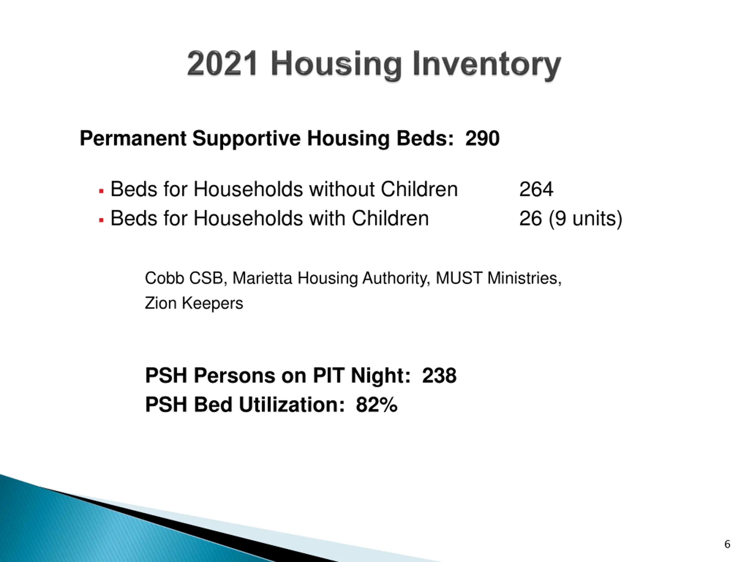 Permanent Supportive Housing Beds: 290 Beds for Households without Children Beds for Households with Children 264 26 (9 units) Cobb CSB, Marietta Housing Authority, MUST Ministries, Zion Keepers PSH Persons on PIT Night: 238 PSH Bed Utilization: 82% 6