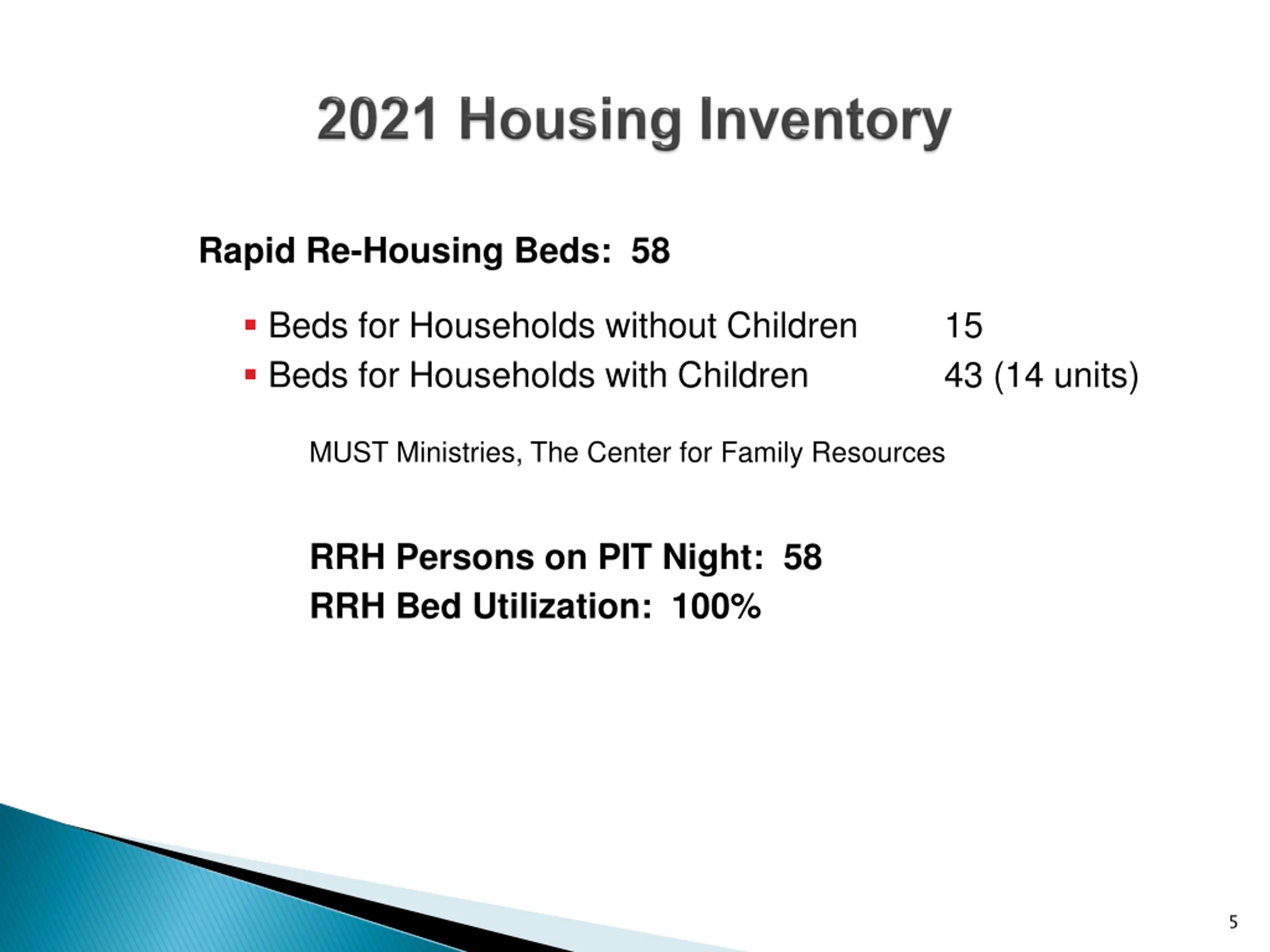 Rapid Re-Housing Beds: 58 Beds for Households without Children Beds for Households with Children 15 43 (14 units) MUST Ministries, The Center for Family Resources RRH Persons on PIT Night: 58 RRH Bed Utilization: 100% 5