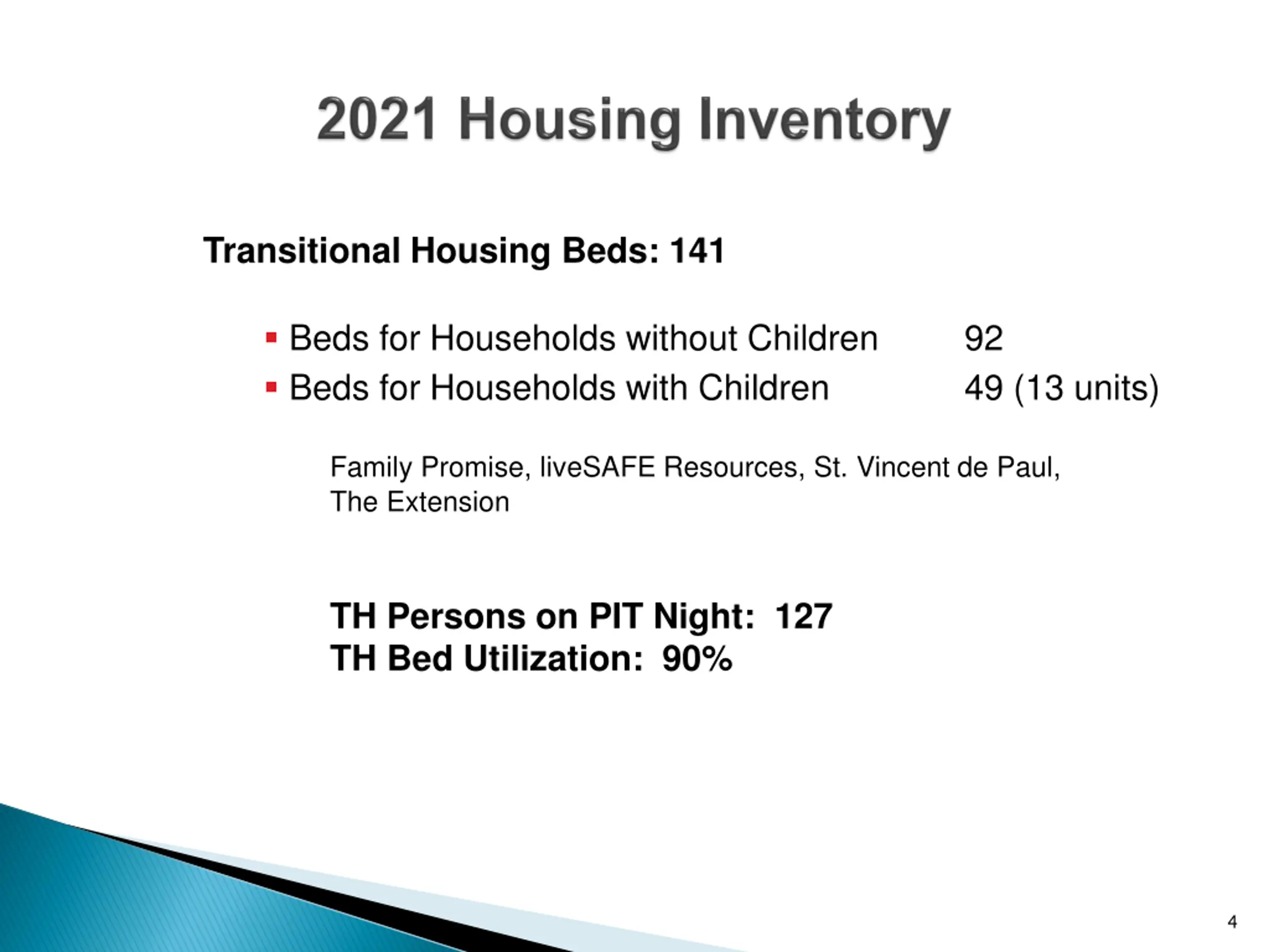 Transitional Housing Beds: 141 Beds for Households without Children Beds for Households with Children 92 49 (13 units) Family Promise, liveSAFE Resources, St. Vincent de Paul, The Extension TH Persons on PIT Night: 127 TH Bed Utilization: 90% 4